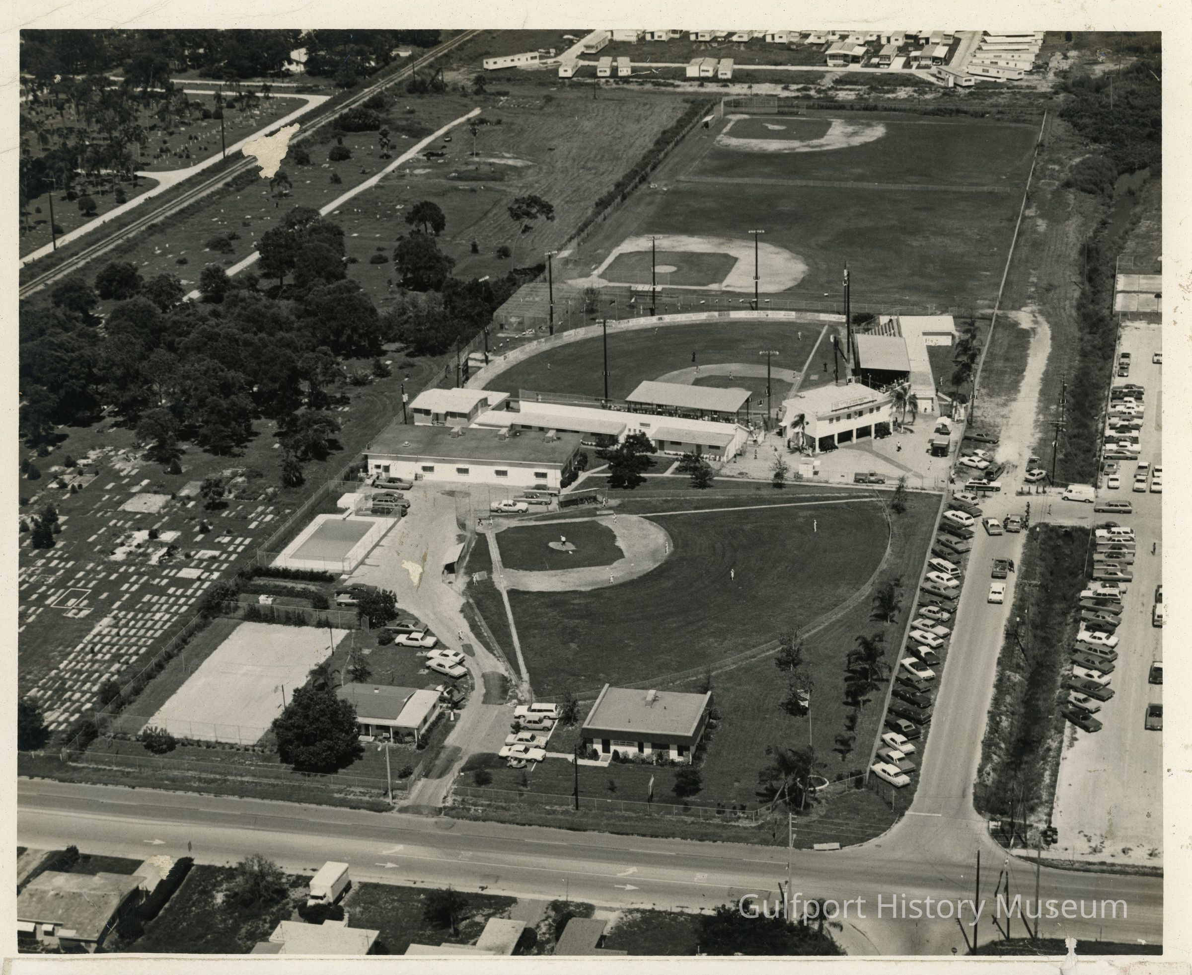 "Aerial photograph of Little League Baseball's fourteen acre facility known as the Southern Regional Headquarters and Training Center, located at 658 58th Street South in Gulfport. This view highlights the Administration Building, all-purpose court for basketball, badminton, etc., swimming pool, four baseball diamonds, batting cages with pitching machines, Recreation & Dining Hall and the Dormitory Sections, (all buildings are air-conditioned). Little League Baseball's Summer Camp, with the first session starting June 16th has been one of the year's highlights (?) for the past six seasons."