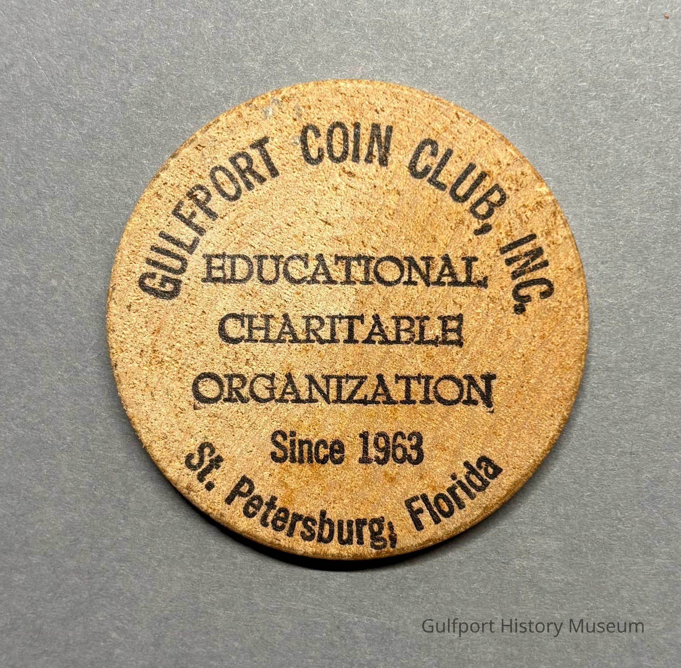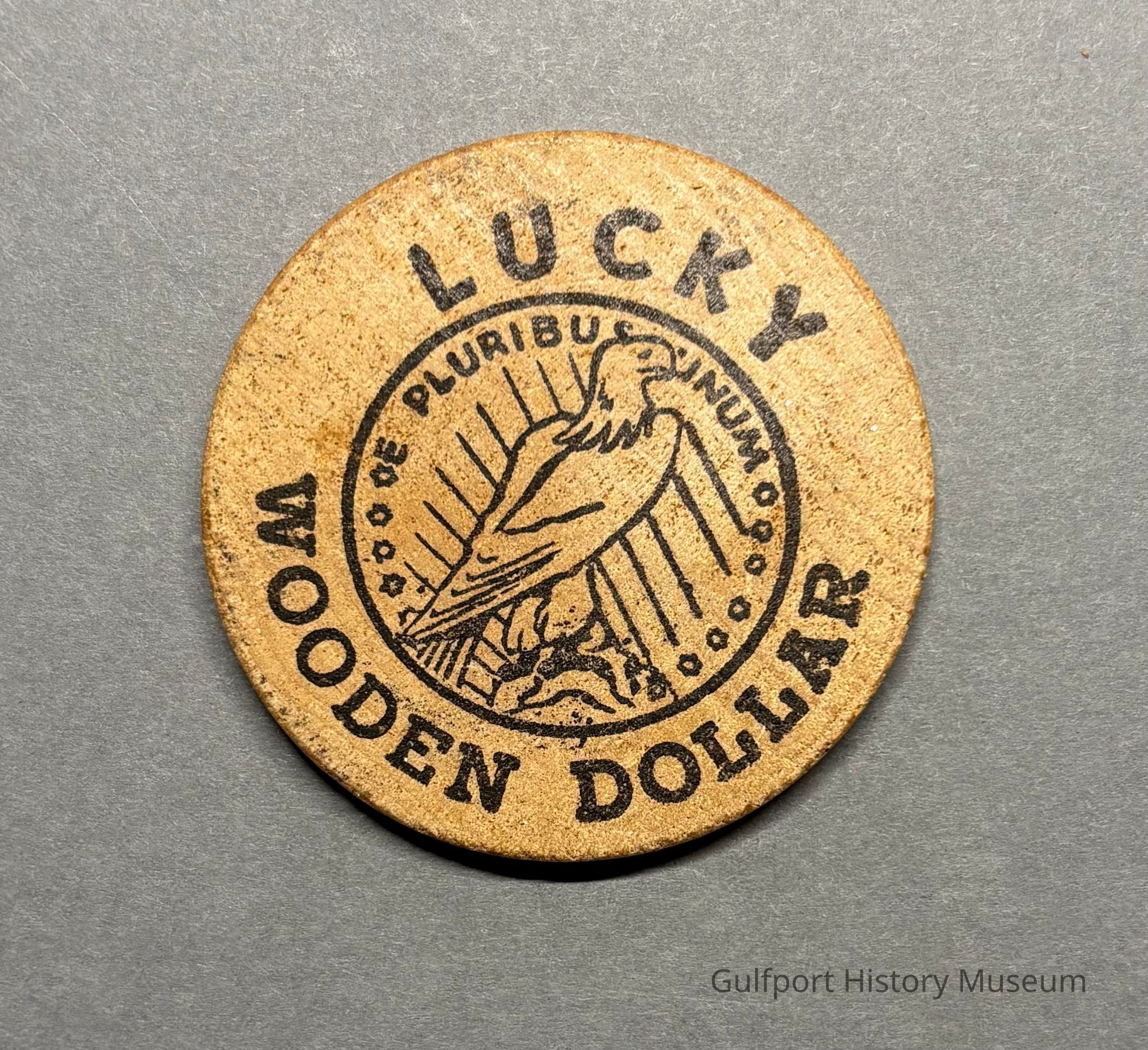 A "lucky" wooden dollar from the Gulfport Coin Club.