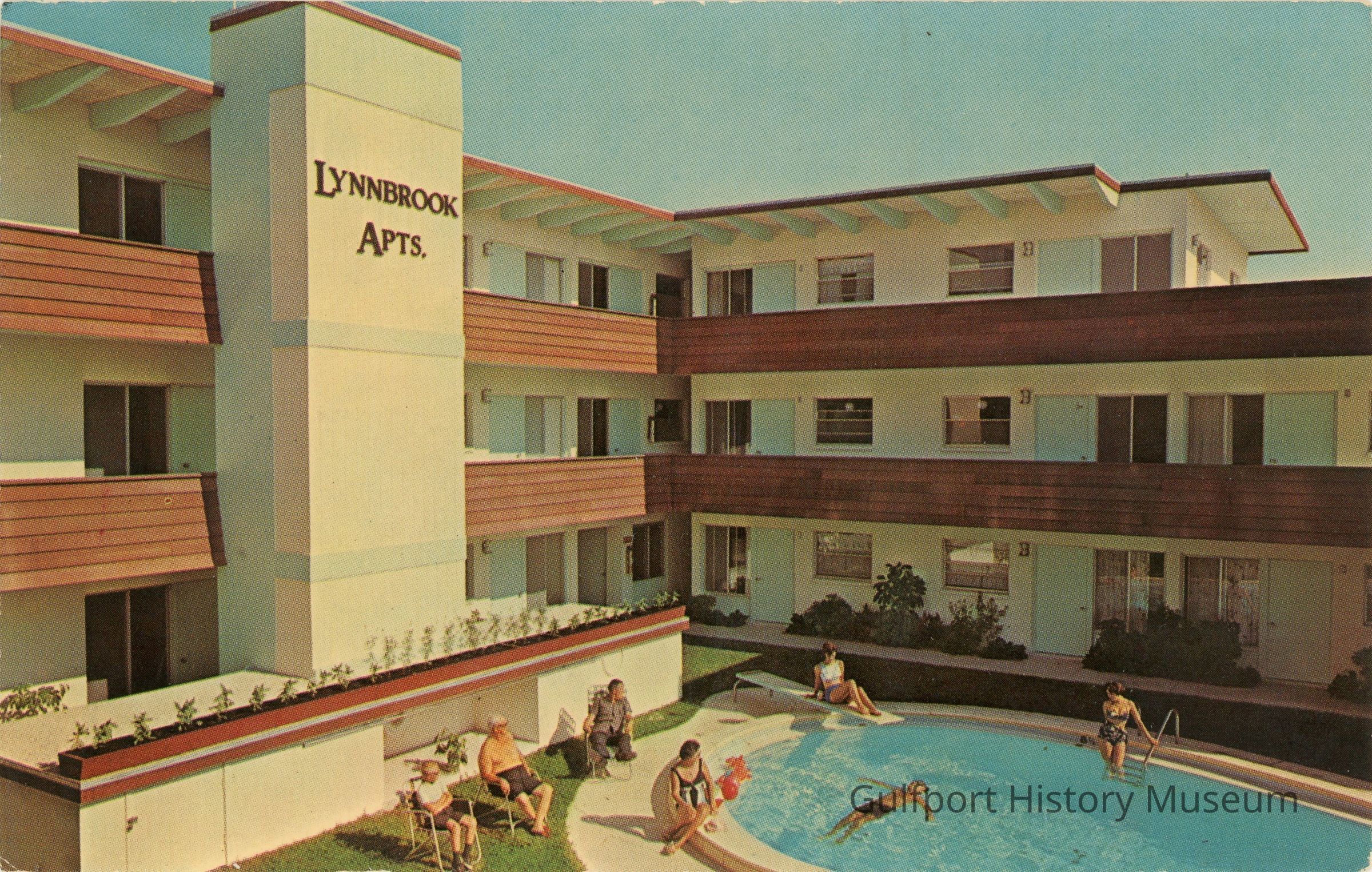 A color photochrome postcard of the Lynnbrook Apartments at 3209 58th St S. People can be seen lounging in and around the pool.