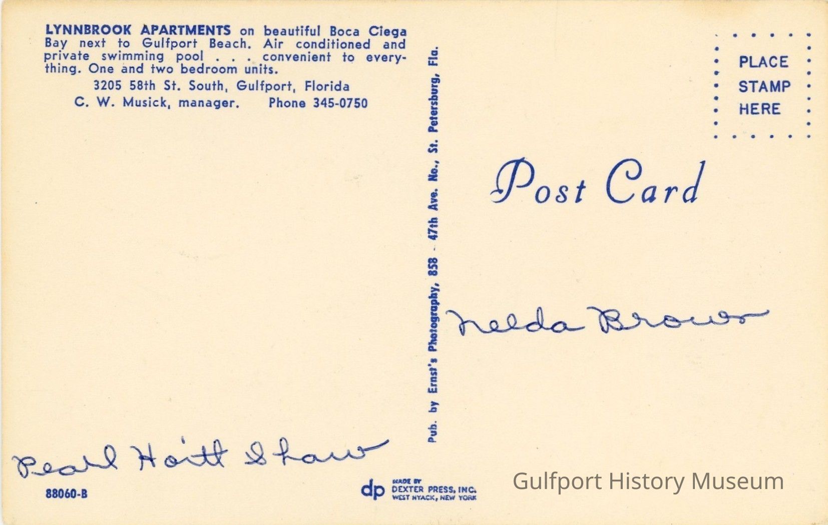 LYNNBROOK APARTMENTS on beautiful Boca Ciega Bay next to Gulfport Beach. Air conditioned and private swimming pool . . . convenient to everything. One and two bedroom units. 3205 58th St. South, Gulfport, Florida C.W. Musick, manager. Phone 345-0750