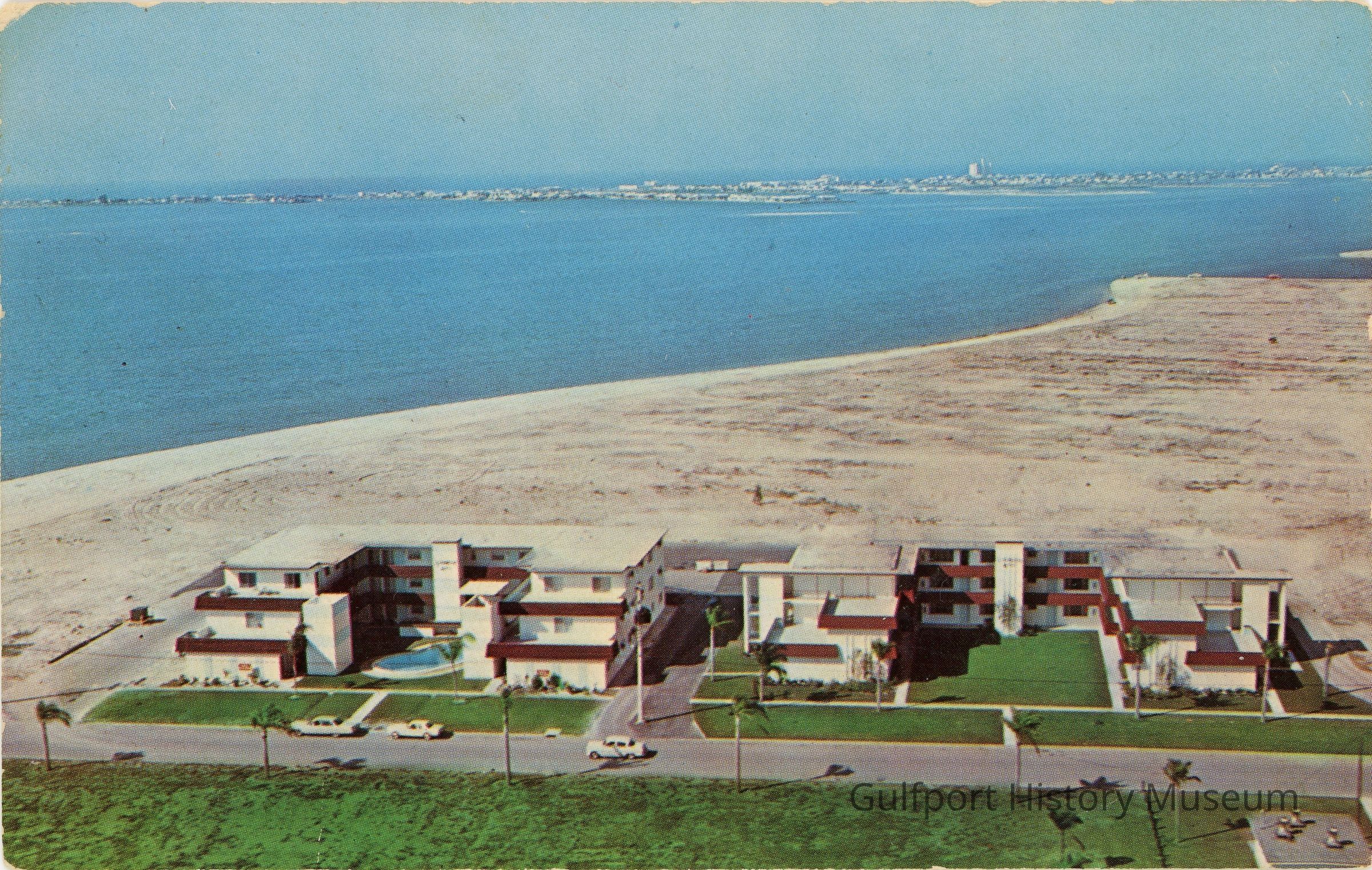 A scan of a color photochrome postcard showing a low aerial view of Lynnbrook Apartments at 3205 58th St S on Boca Ciega Bay. The future site of Town Shores is behind them, pictured as a large, empty lot. St. Pete Beach is visible in the distance.Subject