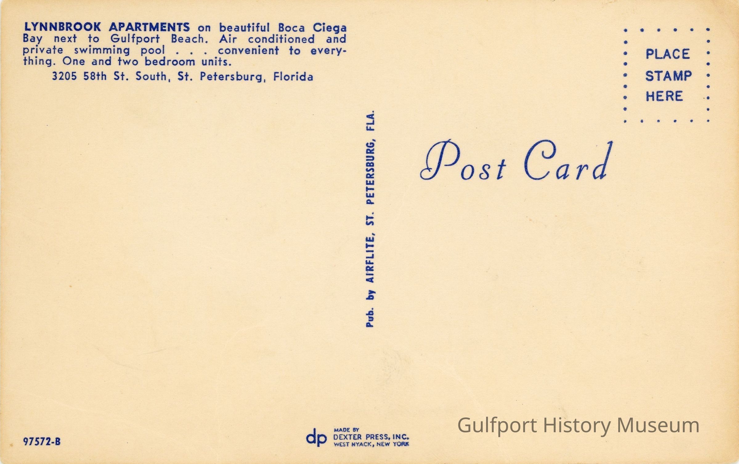 LYNNBROOK APARTMENTS on beautiful Boca Ciega Bay next to Gulfport Beach. Air conditioned and private swimming pool . . . convenient to everything. One and two bedroom units.
