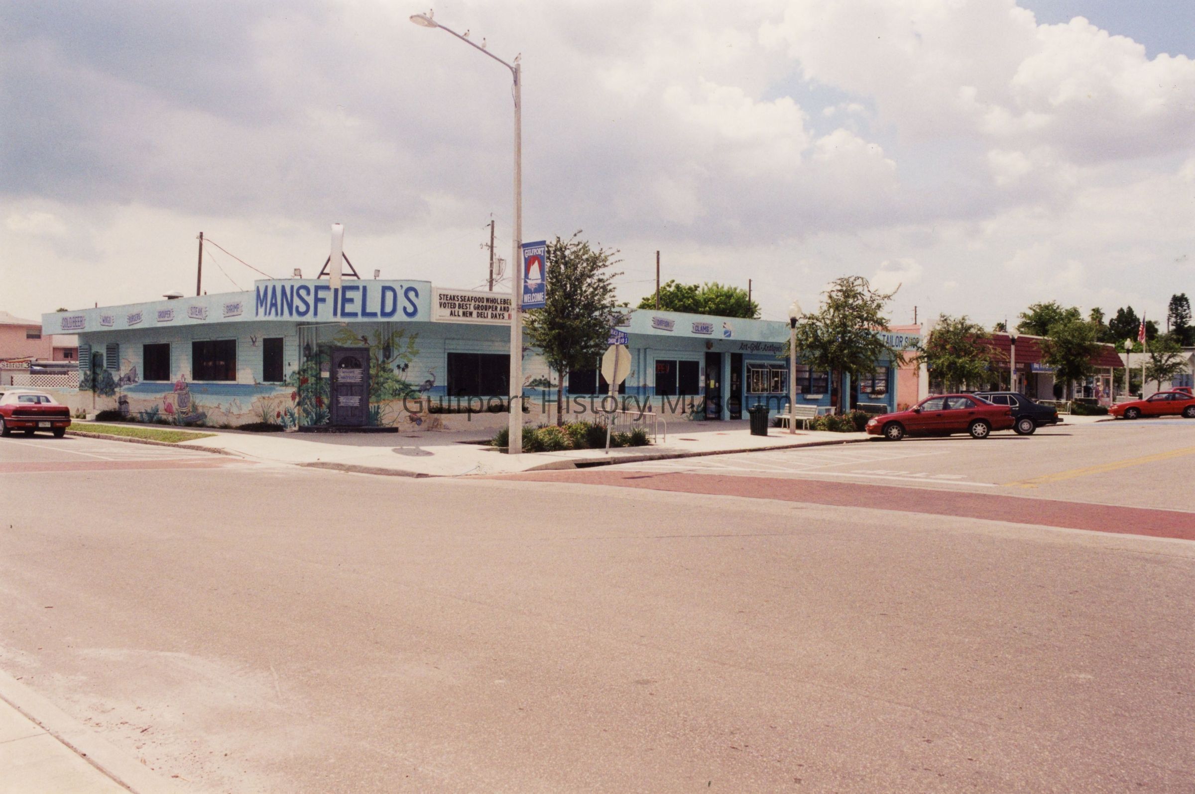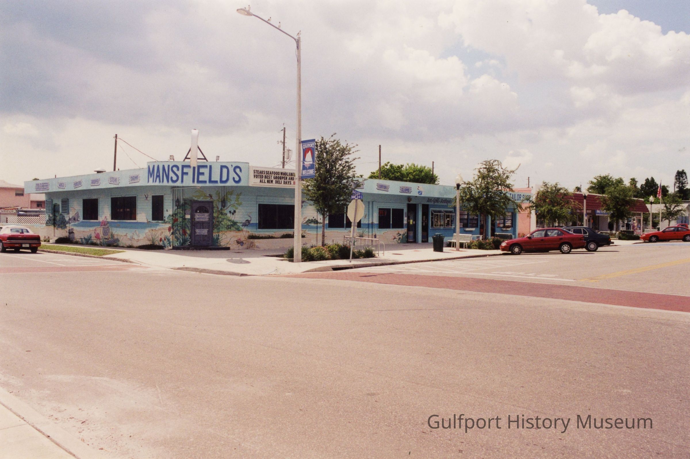 A color photograph of businesses on the west side of the 3100 block of Beach Blvd at Shore Blvd looking northwest, including Mansfield's. Cars are parked diagonally in the road. An American flag banner and a banner that reads, "GULFPORT WELCOME" hang from streetlights. Benches are on the sidewalks.