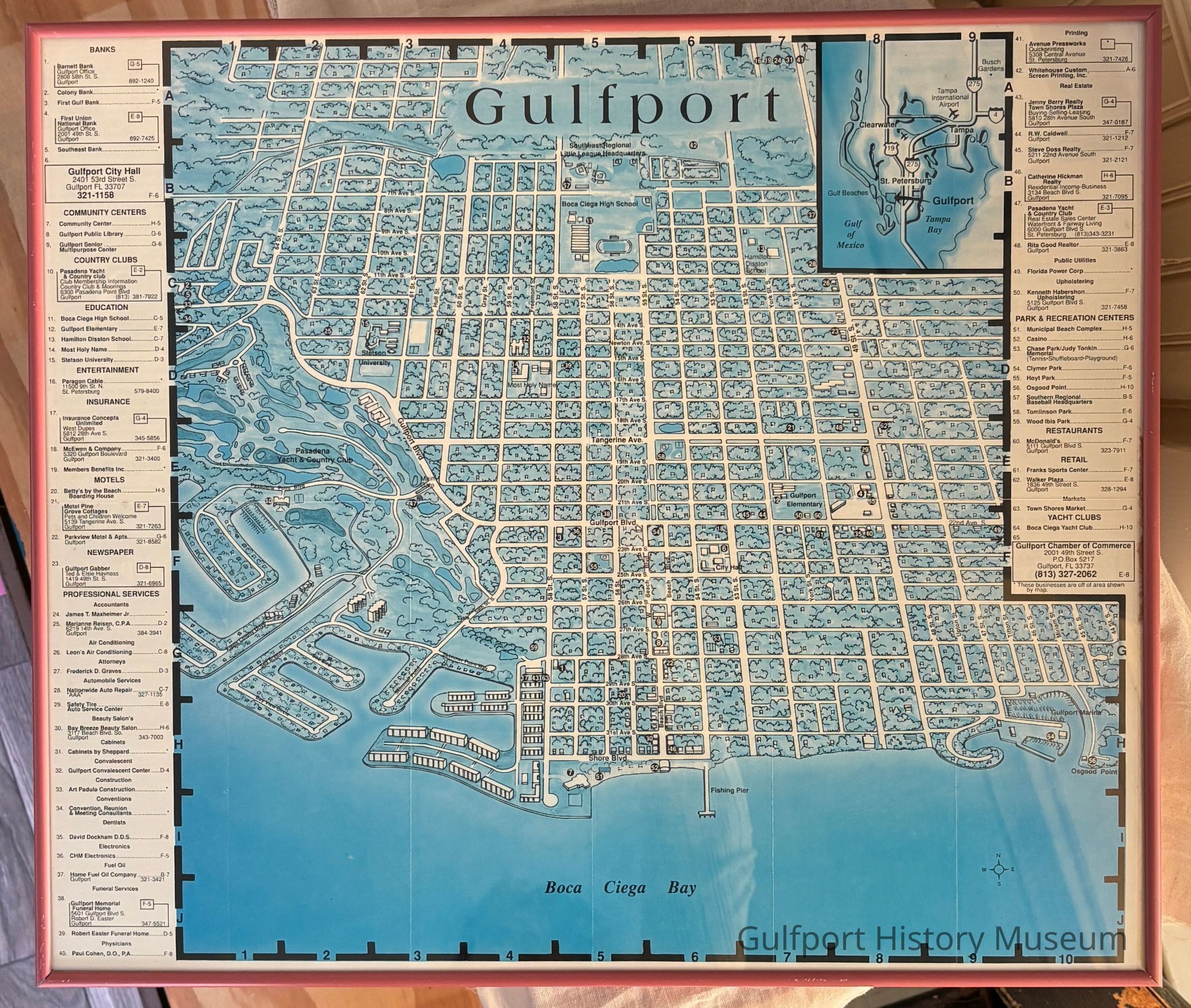 A framed illustrated map of Gulfport with points of interest and business listings. Likely the inside of a folded pamphlet.
