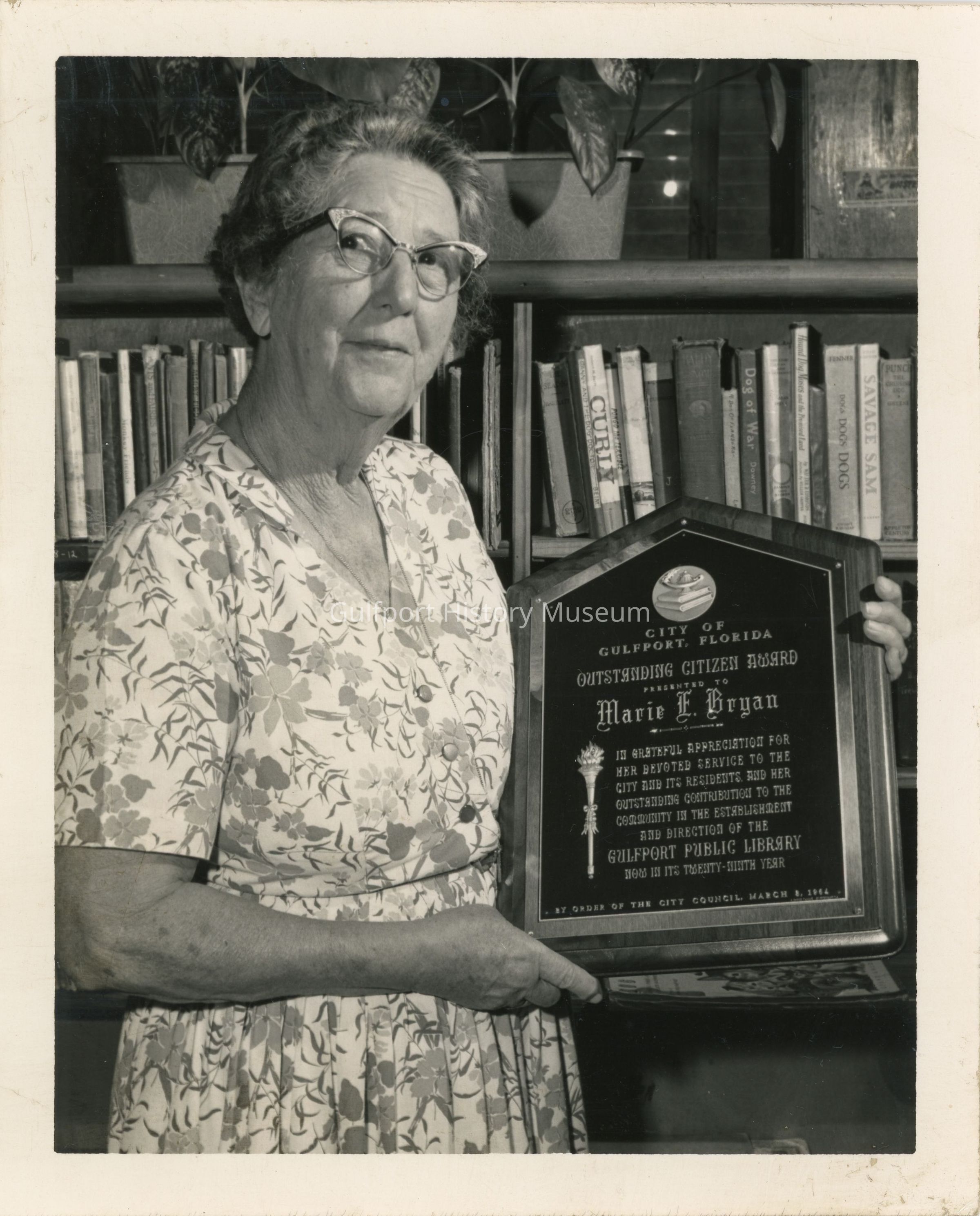 A black and white photograph of a woman in a library. She is holding a plaque which reads, in part, "CITY OF GULFPORT, FLORIDA OUTSTANDING CITIZEN AWARD PRESENTED TO Marie E. Bryan."