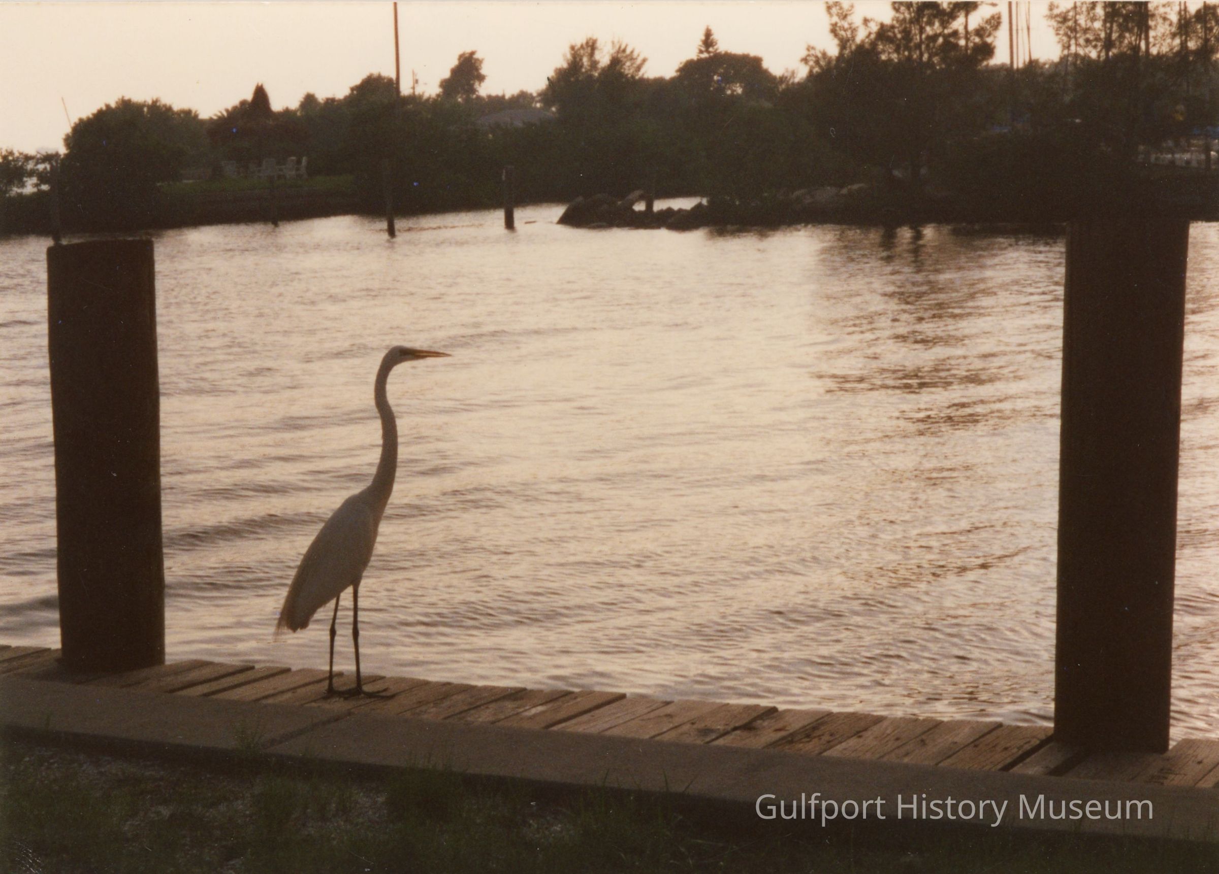 A color photograph of [an egret[ standing on a dock near Clam Bayou Nature Park and Gulfport Marina.