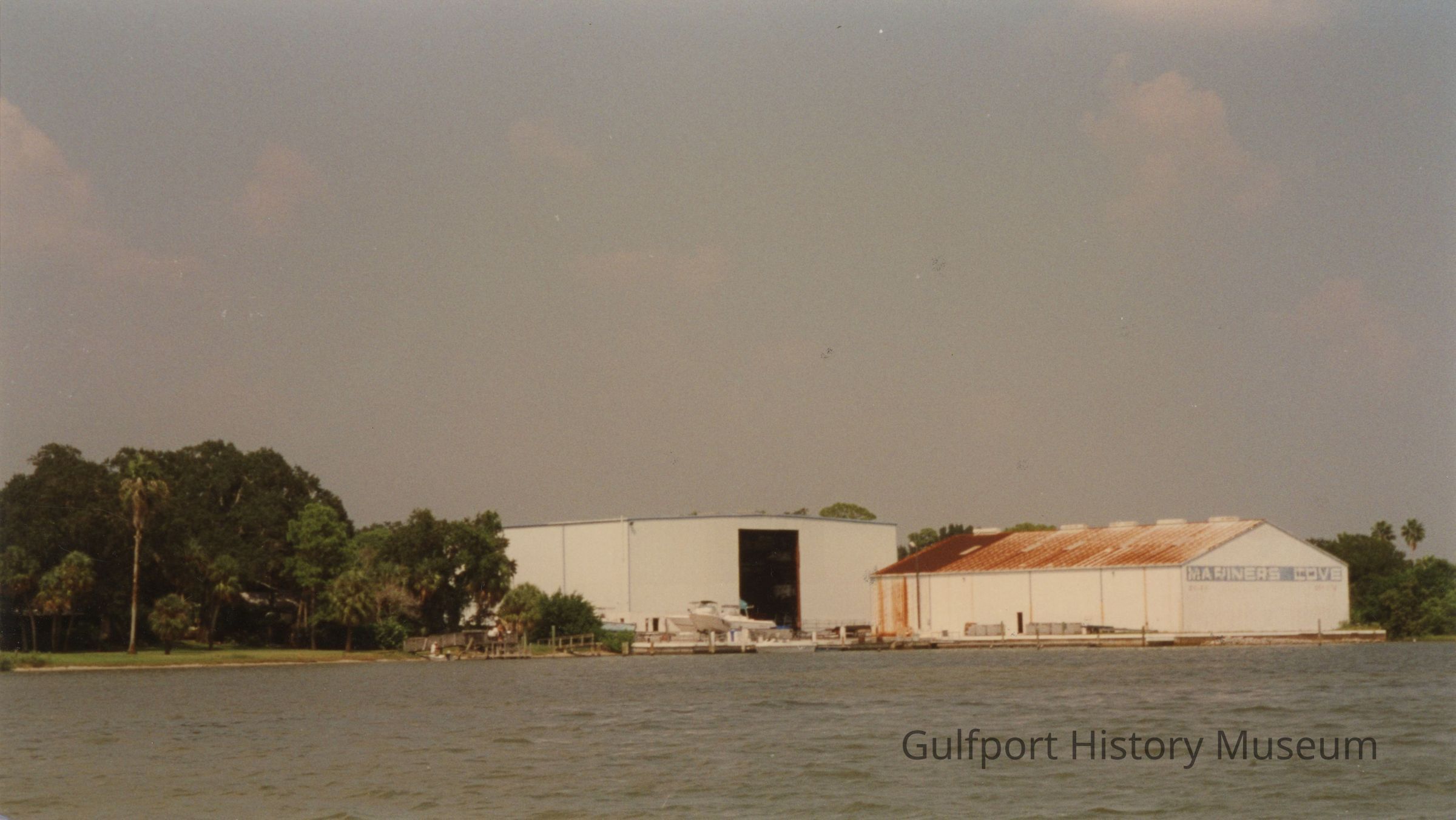 A slightly faded color photograph of Mariner's Cove from Boca Ciega Bay. A few boats can be seen docked outside.