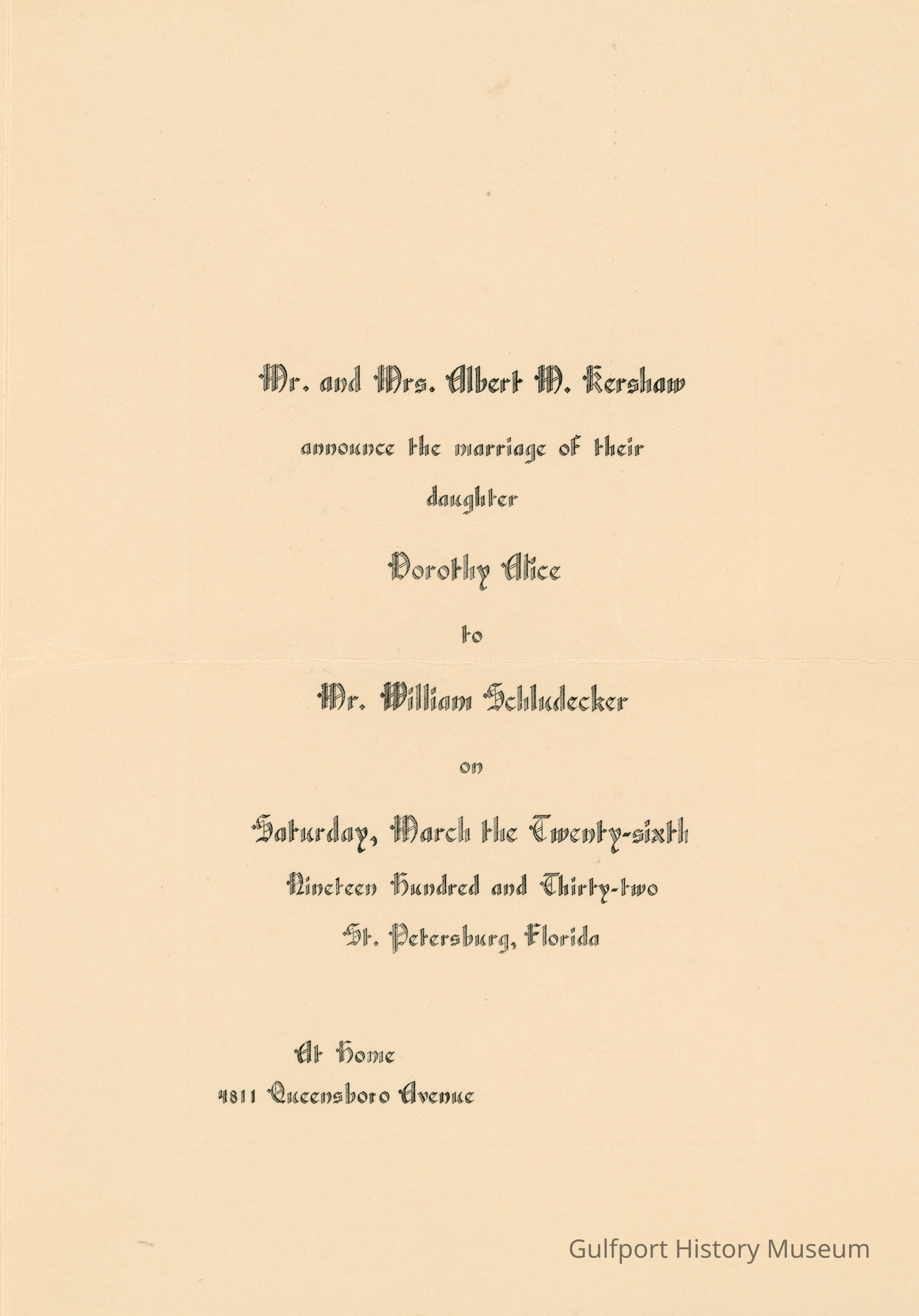 Mr. And Mrs. Albert M. Kershaw announce the marriage of their daughter Dorothy Alice to Mr. William Schludecker on Saturday, March the Twenty-sixth Nineteen hundred and Thirty-two St. Petersburg, Florida