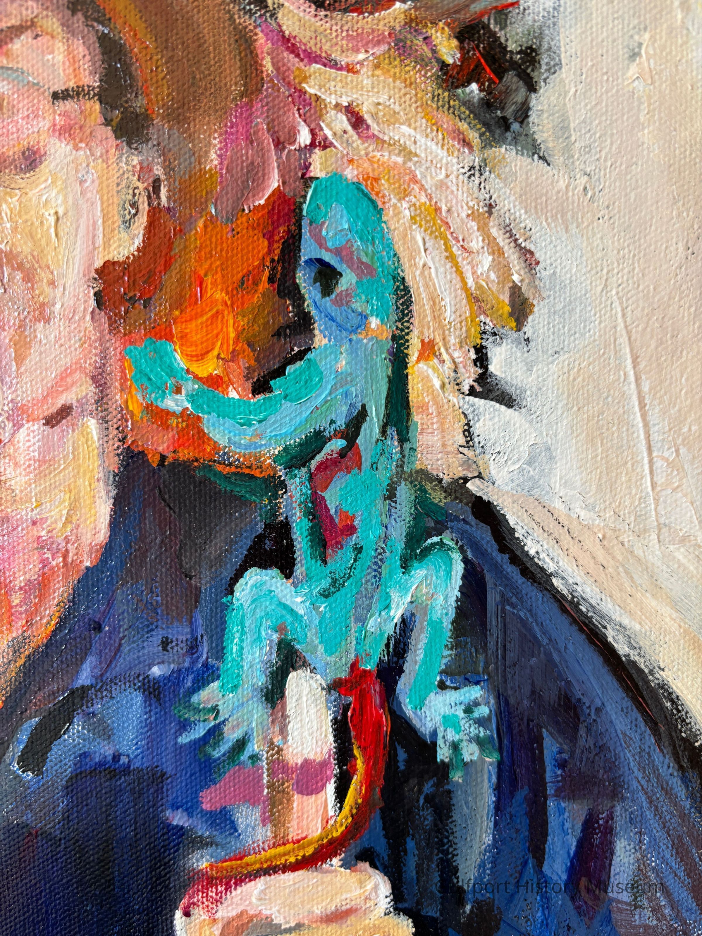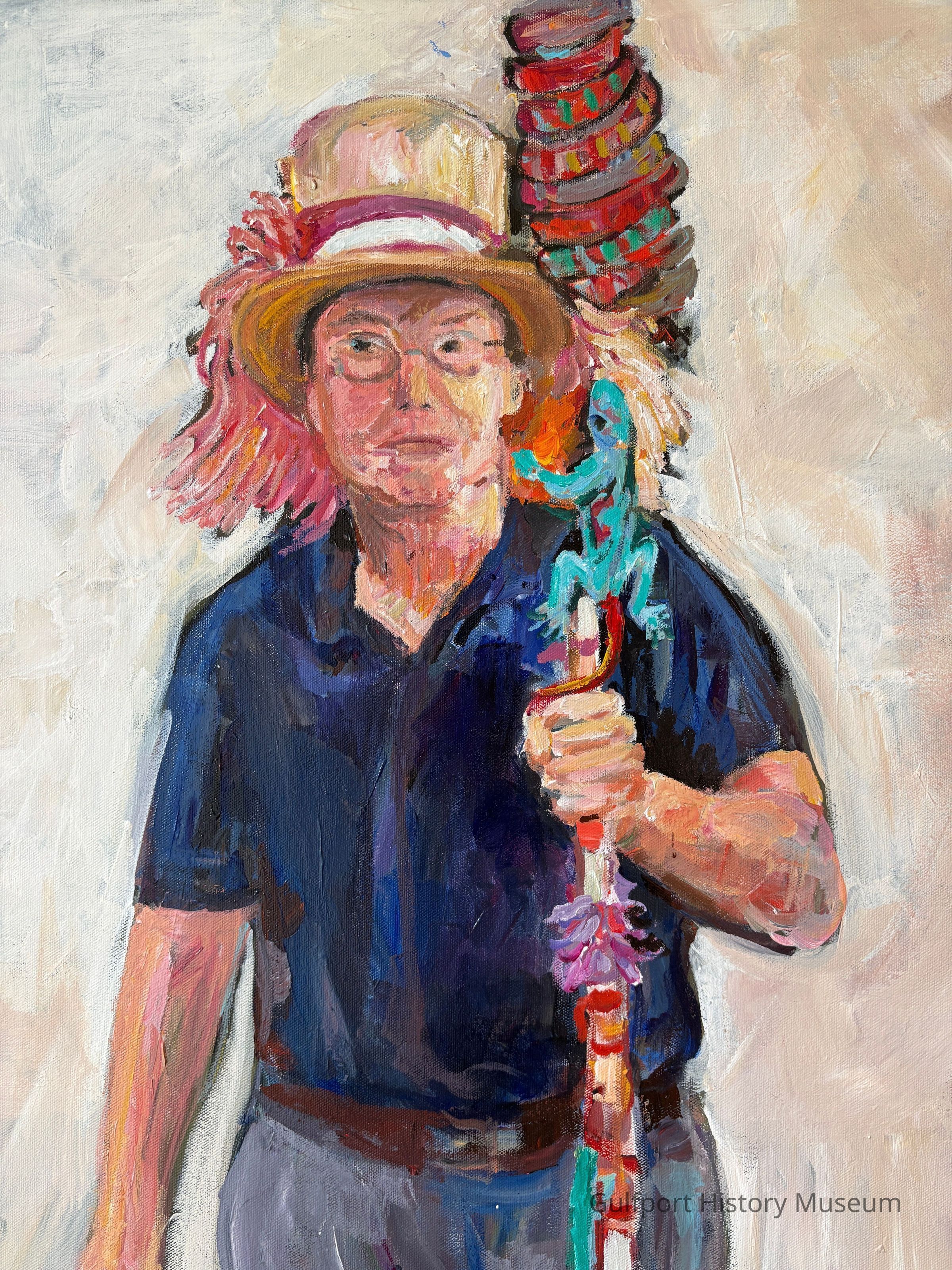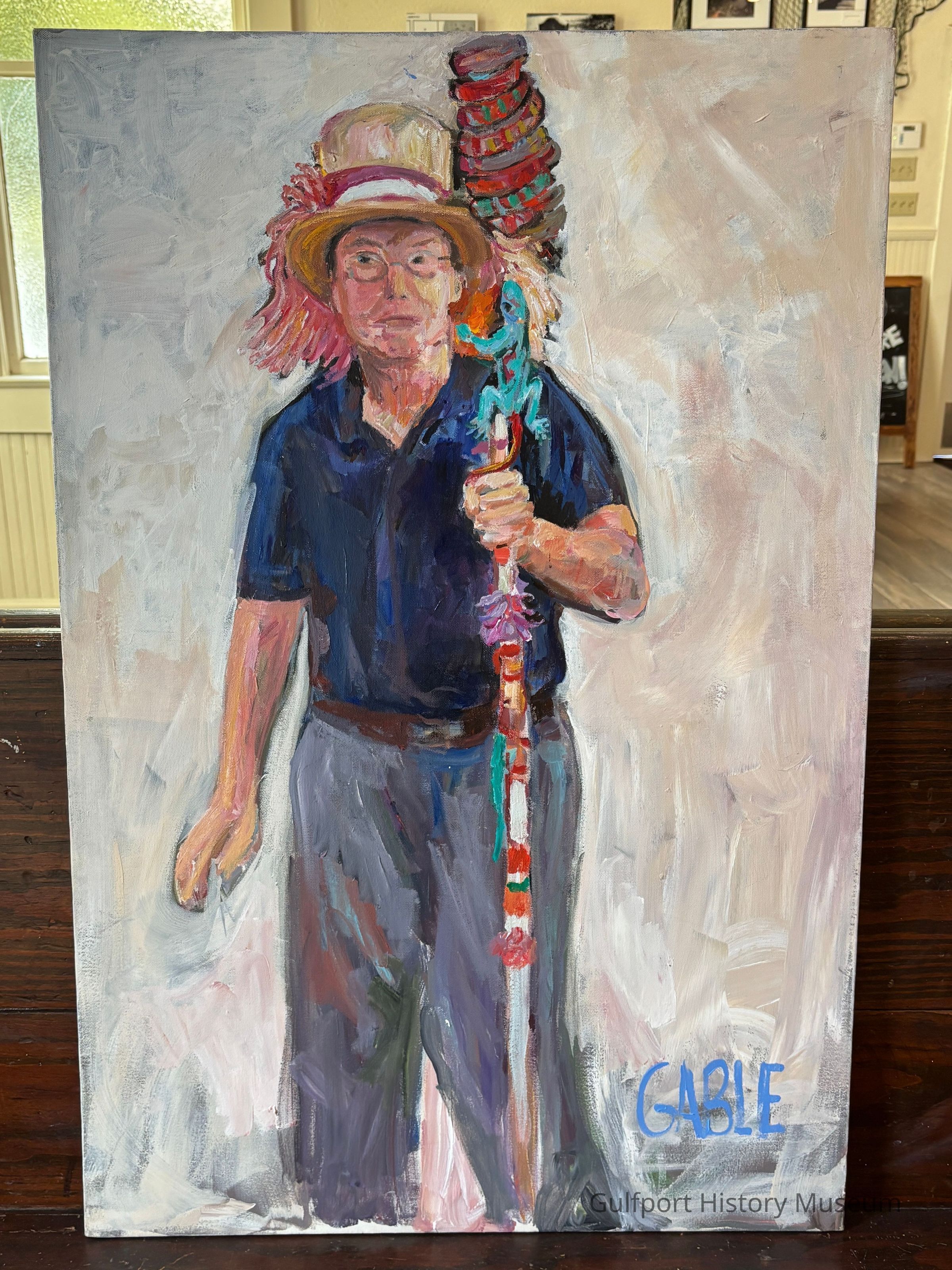 A painting of Mayor Michael J. Yakes leading the parade at GeckoFest 2013. He wears a hat and holds a staff.
