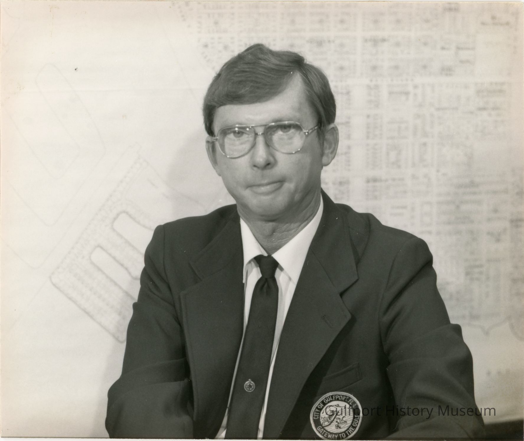 A black and white portrait of then councilmember Mike Yakes (Ward 3) wearing a suit and tie. His suit has the seal of Gulfport on the breast pocket which reads "CITY OF GULFPORT, FLA. GATEWAY TO THE GULF" and shows an idealized, illustrated image of Gulfport. A large map of Gulfport is behind him.