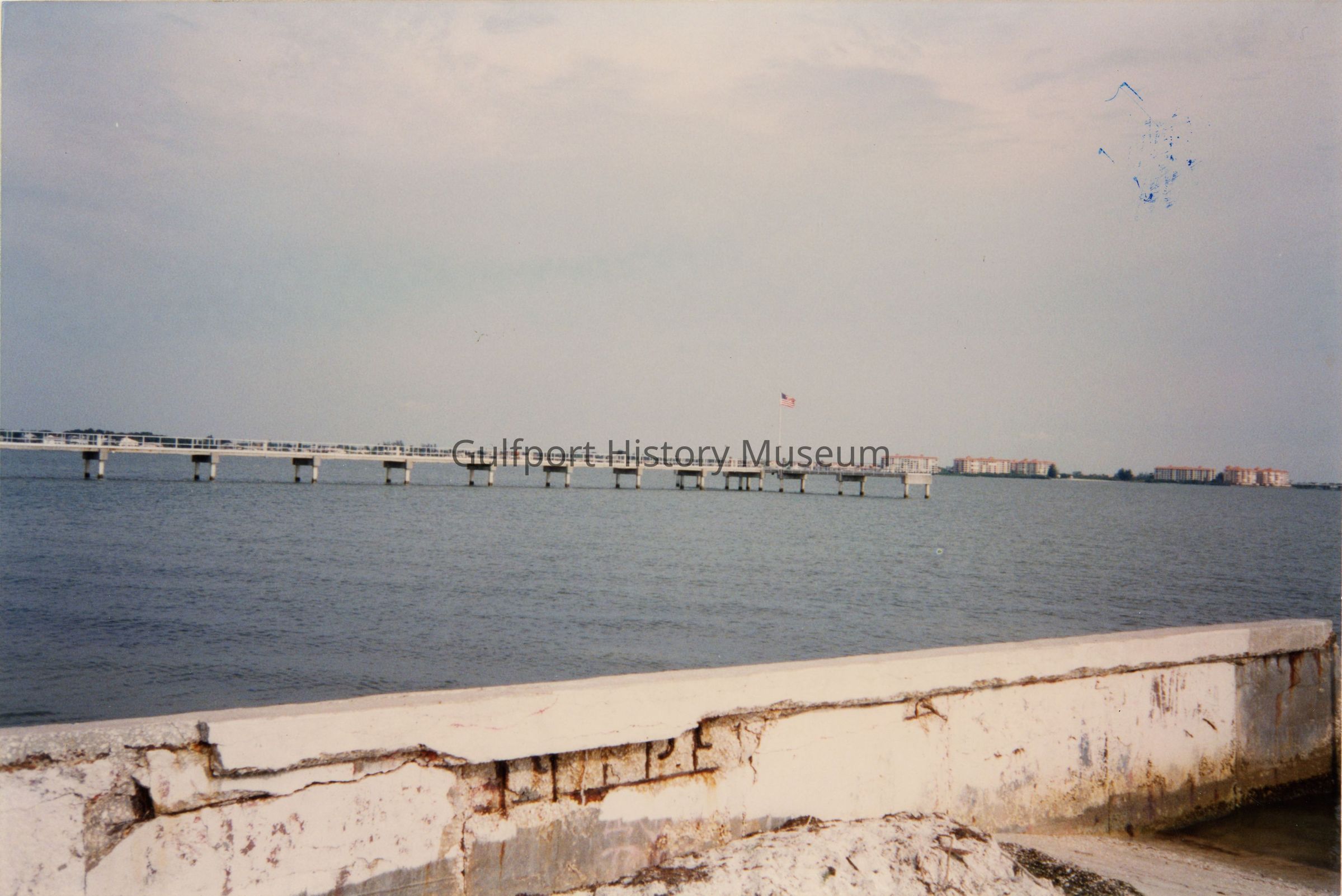 A color photograph of the Municipal/Williams Pier taken from the southeast corner outside of the Gulfport Casino. The pier stretches out into Boca Ciega Bay. At the end of the pier is a flagpole with a raised American flag blowing in the wind. Buildings in south St. Petersburg can be seen along the bay in the background.