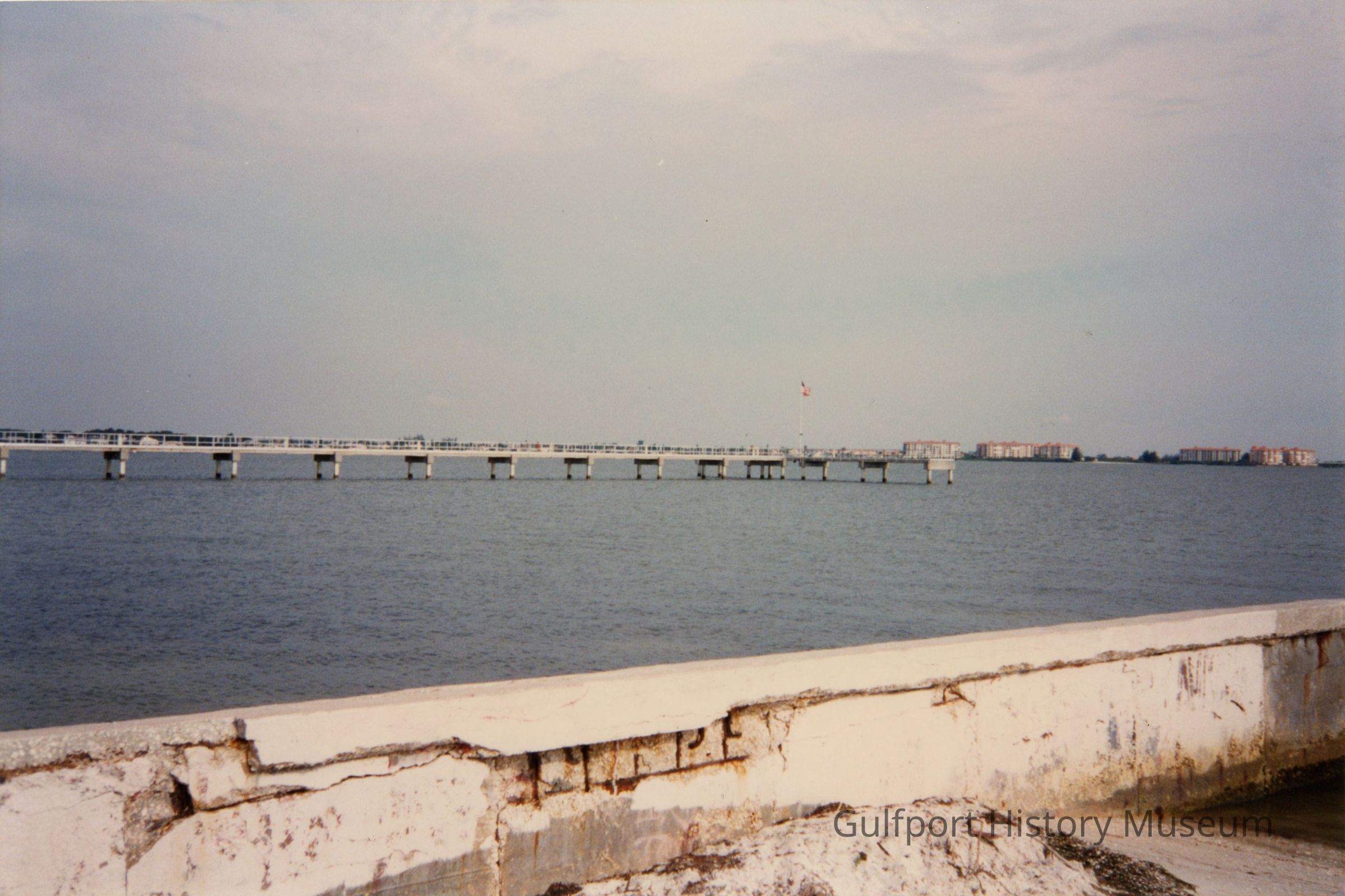 A color photograph of the Municipal/Williams Pier taken from the southeast corner outside of the Gulfport Casino. The pier stretches out into Boca Ciega Bay. At the end of the pier is a flagpole with a raised American flag blowing in the wind. Buildings in south St. Petersburg can be seen along the bay in the background.