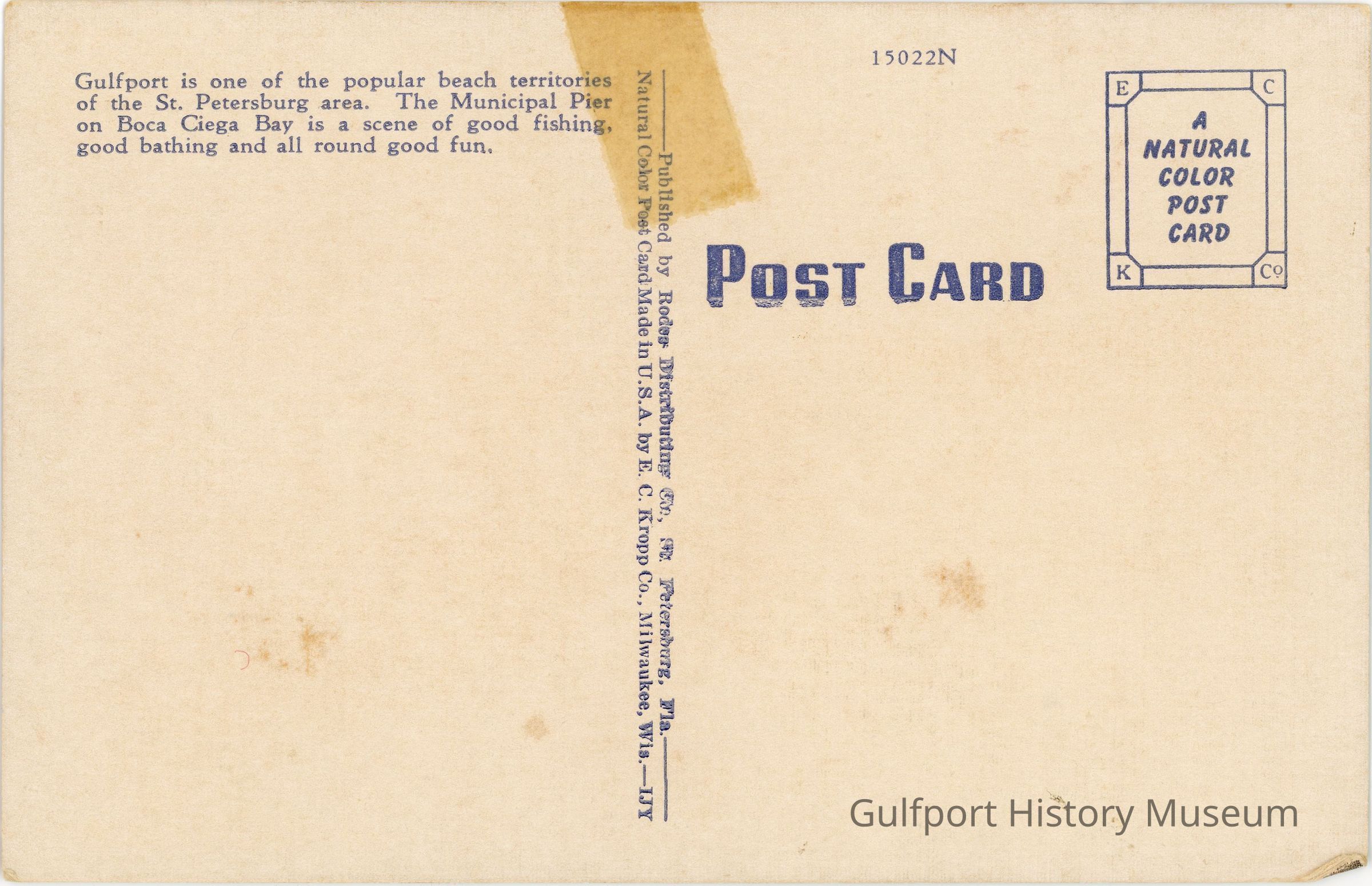 Gulfport is one of the popular beach territories / of the St. Petersburg area. The Municipal Pier / on Boca Ciega Bay is a scene of good fishing, / good bathing and all round good fun.