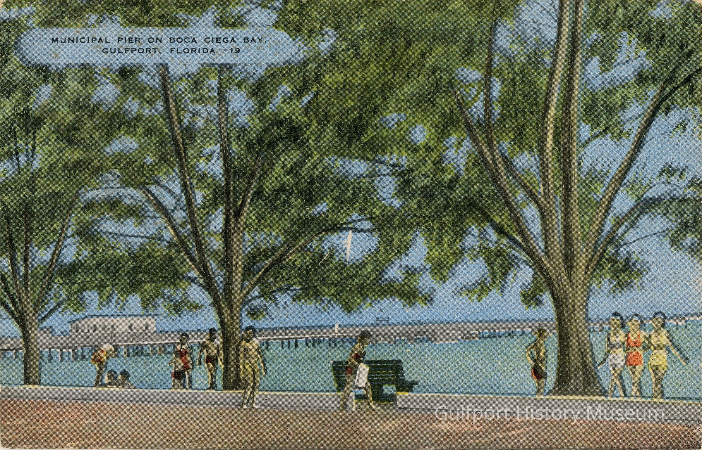 A color linen postcard showing the original wooden Municipal Pier on Boca Ciega Bay. Beachgoers walk along the shore which is lined by trees. A green bench faces the water.