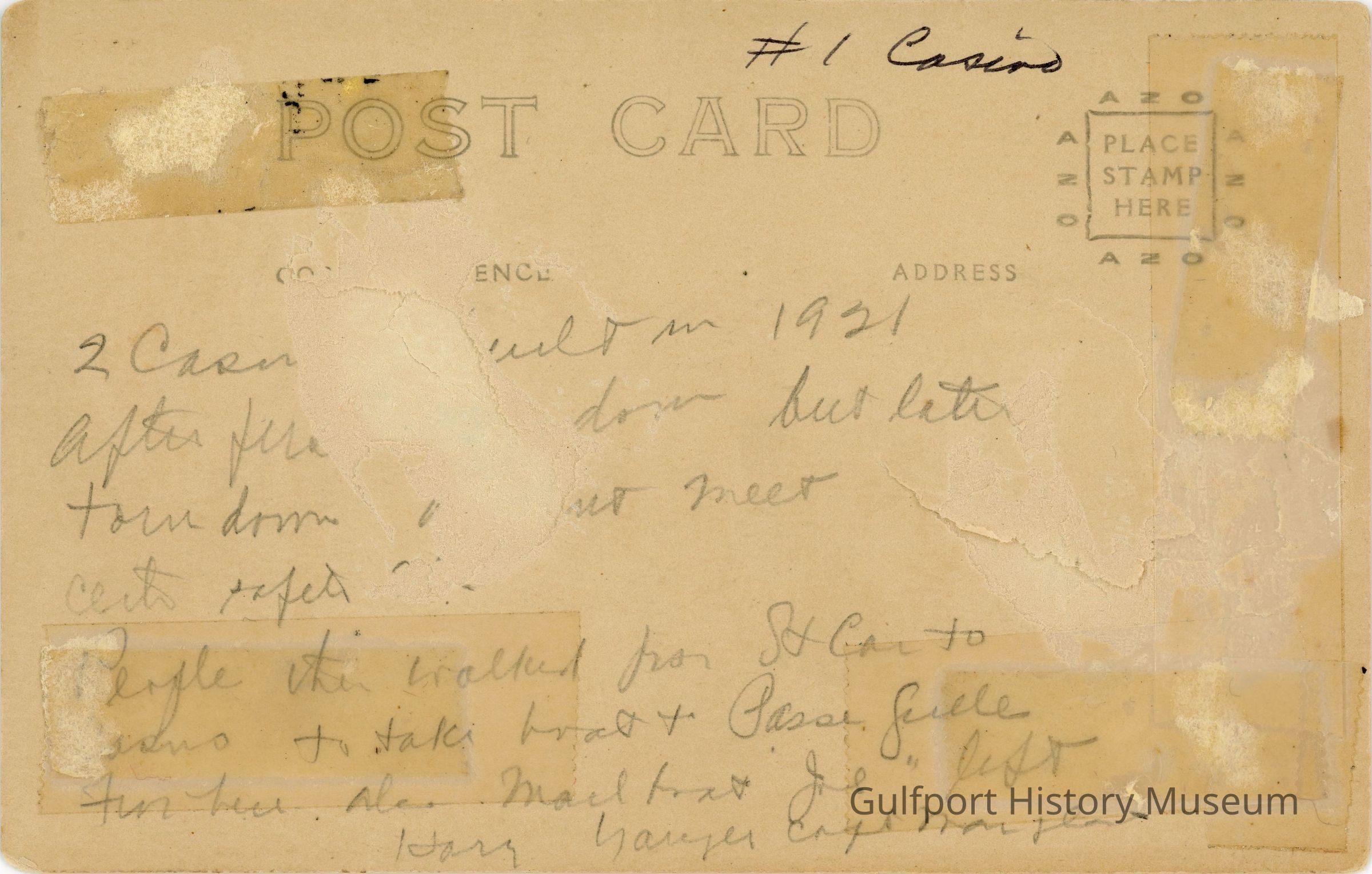 #1 Casino / 2 Casino built in 1921/ After fire [burnt?] down but later / torn down [?]ut meet / certs [?] / People then walked from St. Car [streetcar] to / Casino to take boat + Passe [sic] Grille / fun there also mail boat (?) Joe (?) / Harry Yauger capt (?)Transcriber
