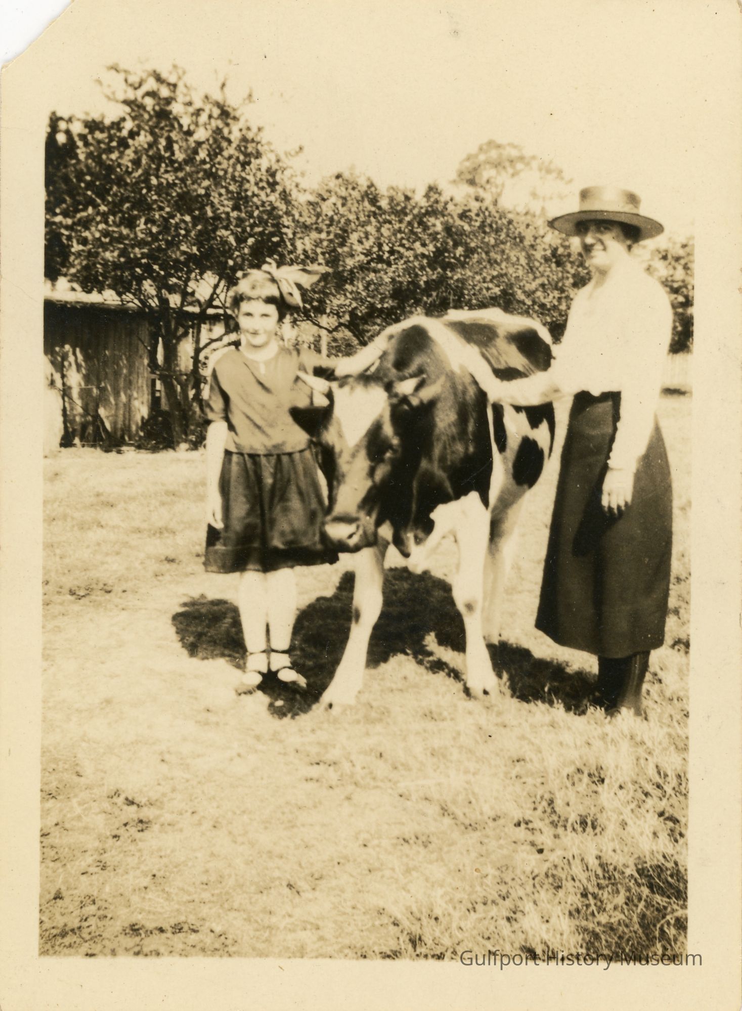 A black and white photograph of Norma Louise Potts and Rosa Schludecker, daughter and mother, with a cow.