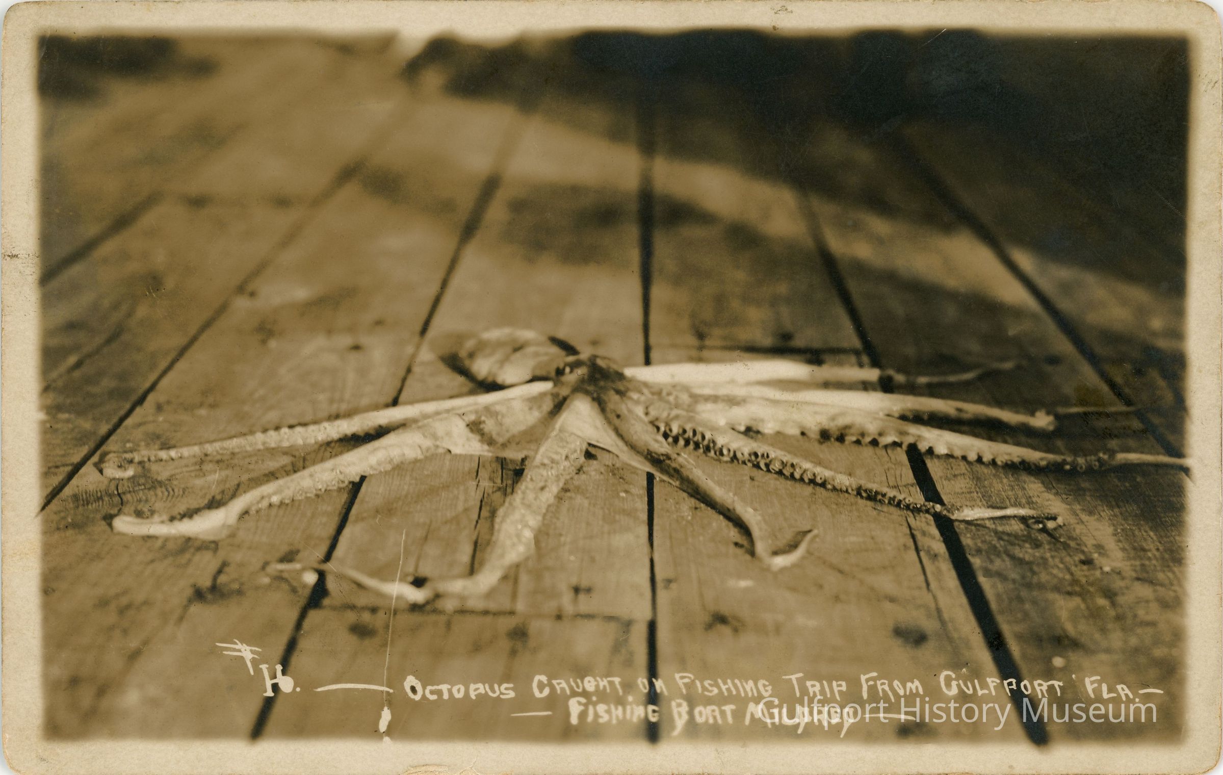 A black and white photograph postcard of a dead octopus, possibly a Mexican Four-Eyed Octopus, lays flat on a wooden dock. "- OCTOPUS CAUGHT ON FISHING TRIP FROM GULFPORT FLA. - - FISHING BOAT MILDRED -"