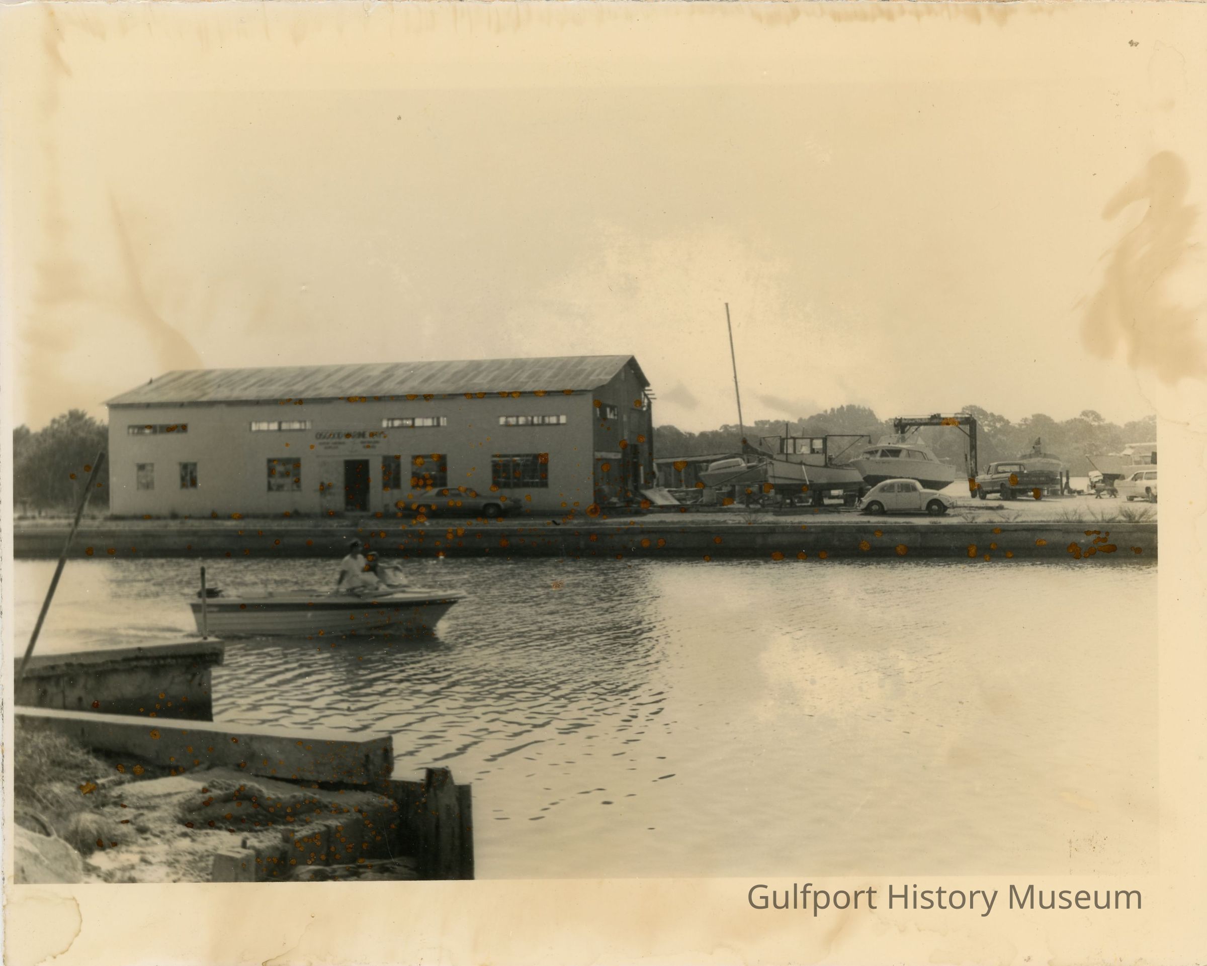 A black and white photograph of Osgood Marine Ways. The photograph was taken from a distance, with a marina in between the photographer and the main building, where two people are on a boat heading towards the right side of the image.