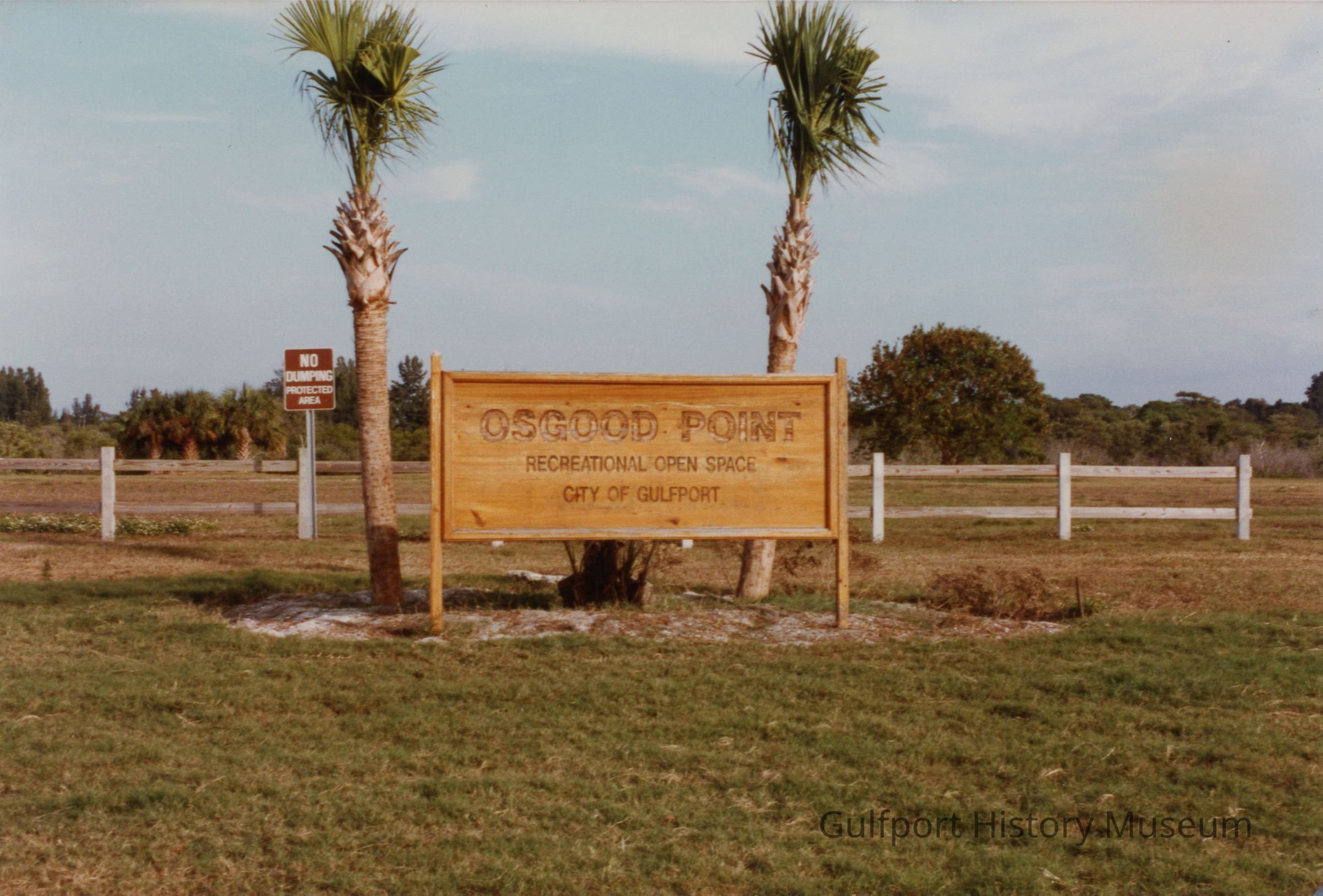 A color photograph of a wooden sign in a field that reads: "OSGOOD POINT RECREATIONAL OPEN SPACE CITY OF GULFPORT." Behind it are two palm trees, a fence, and another sign reading "NO CAMPING RESTRICTED AREA."