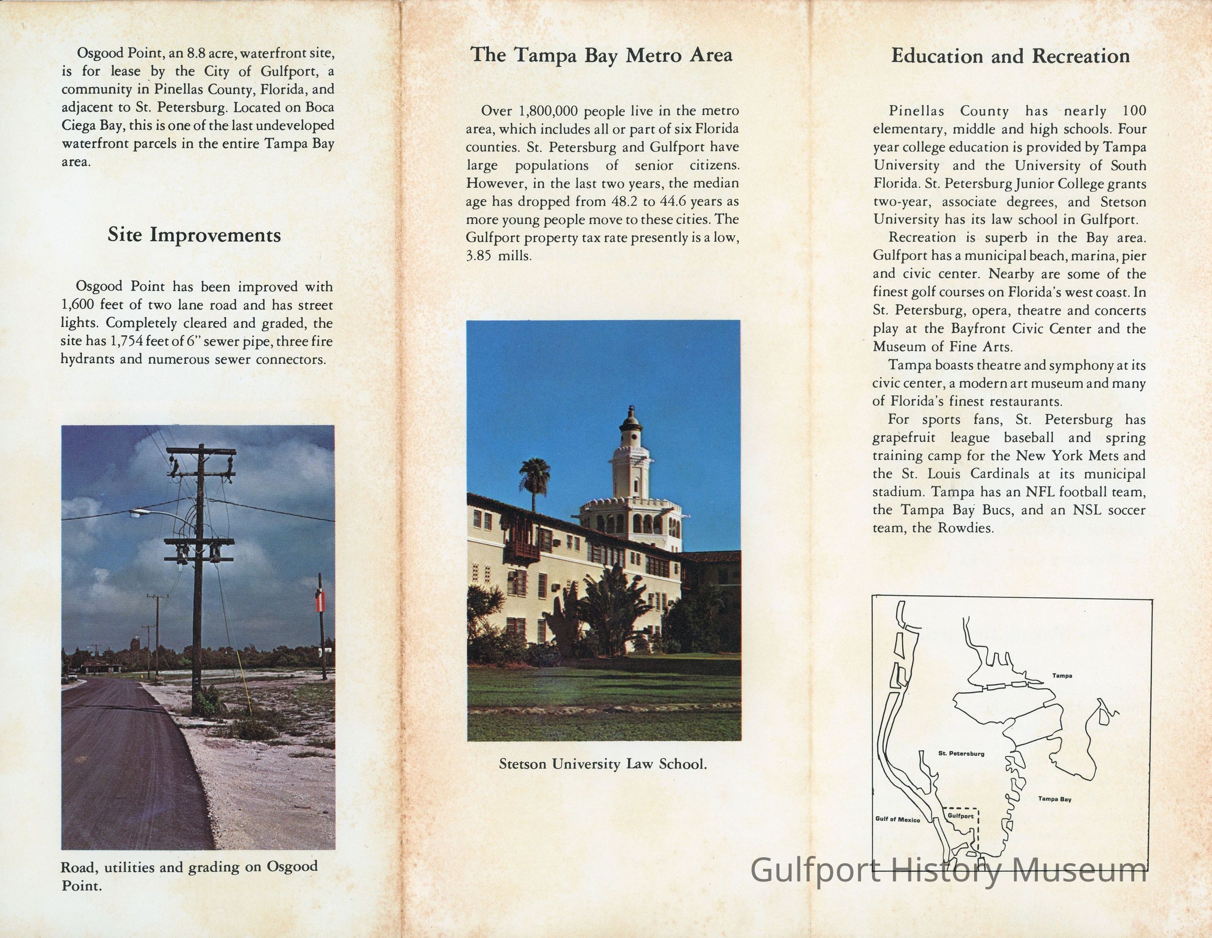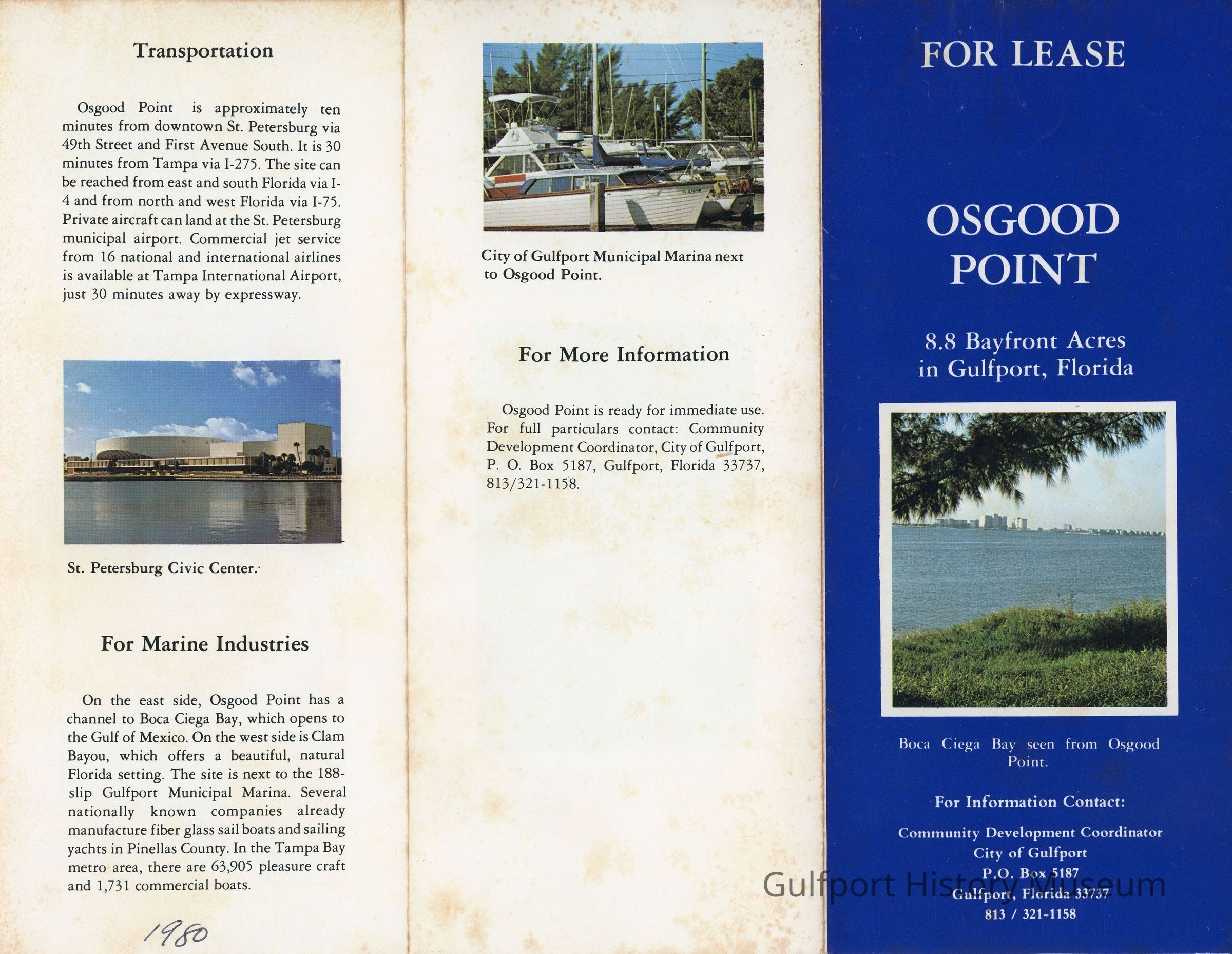 Osgood Point, an 8.8 acre, waterfront site, is for lease by the City of Gulfport, a community in Pinellas County, Florida, and adjacent to St. Petersburg. Located on Boca Ciega Bay, this is one of the last undeveloped waterfront parcels in the entire Tampa Bay area.Transcriber