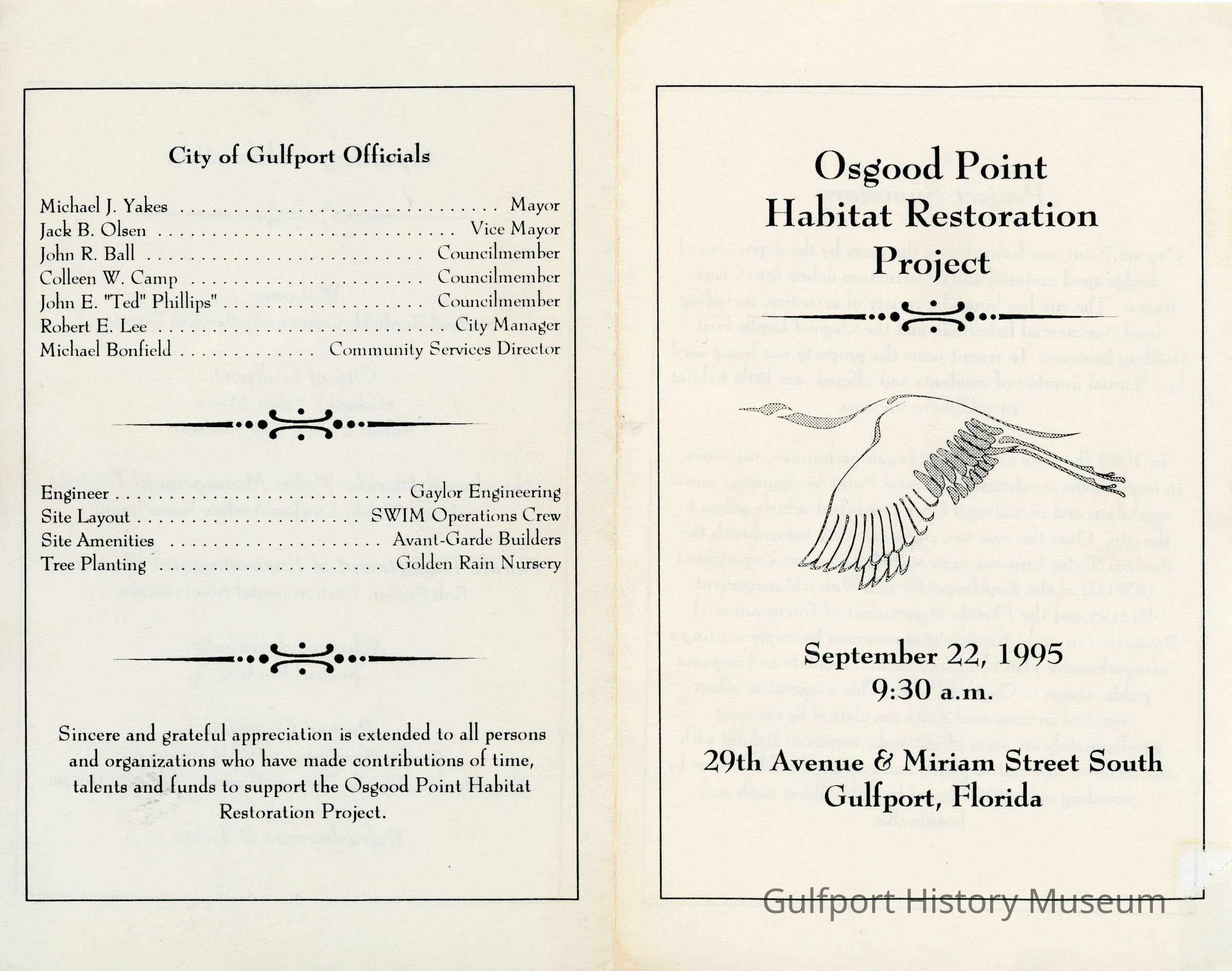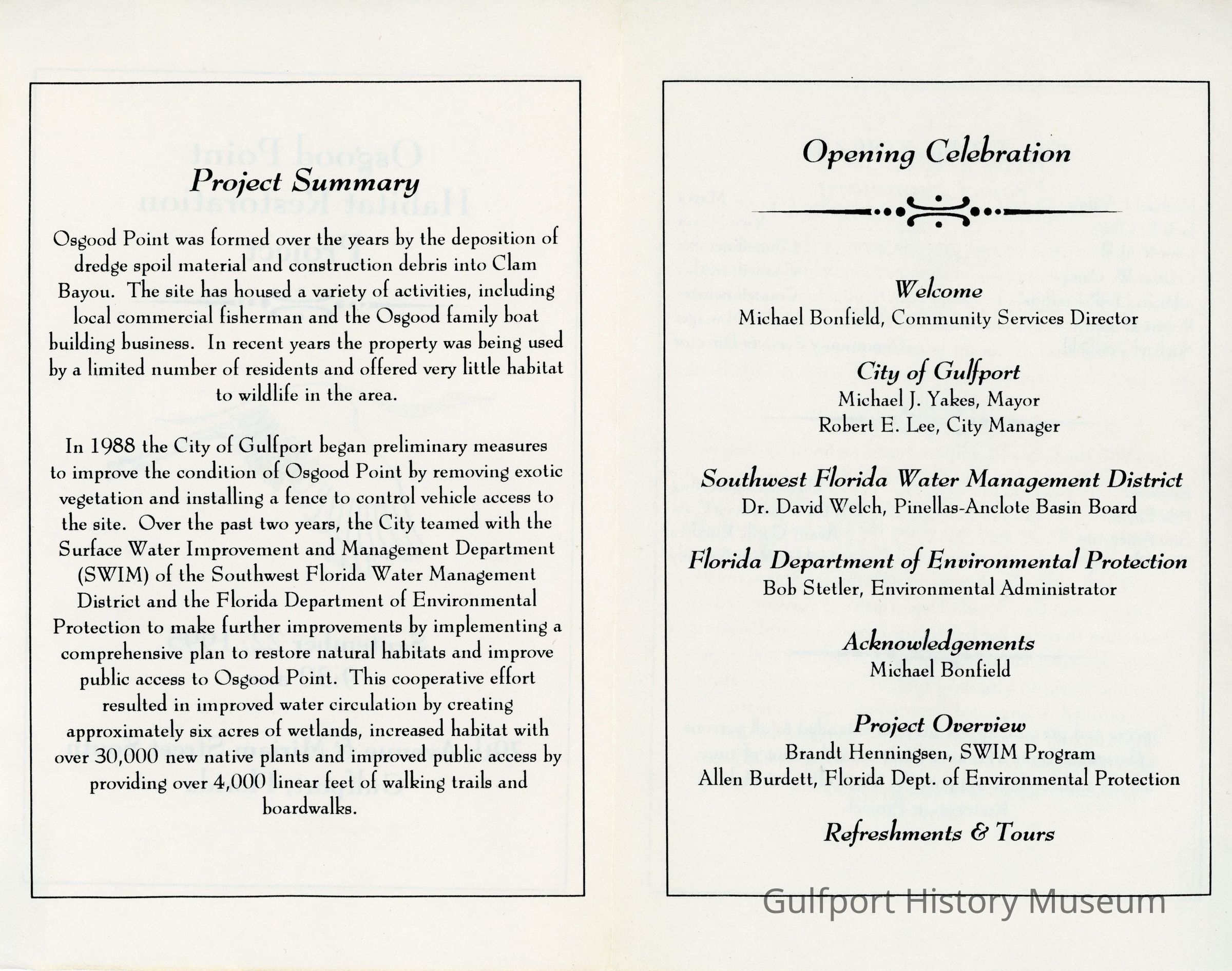 In 1988 the City of Gulfport began preliminary measures to improve the condition of Osgood Point by removing exotic vegetation and installing a fence to control vehicle access to the site. Over the past two years, the City teamed with the Surface Water Improvement and Management Department (SWIM) of the Southwest Florida Water Management District and the Florida Department of Environmental Protection to make further improvements by implementing a comprehensive plan to restore natural habitats and improve public access to Osgood Point. This cooperative effort resulted in improved water circulation by creating approximately six acres of wetlands, increased habitat with over 30,000 new native plants and improved public access by providing over 4,000 linear feet of walking trails and boardwalks.Transcriber