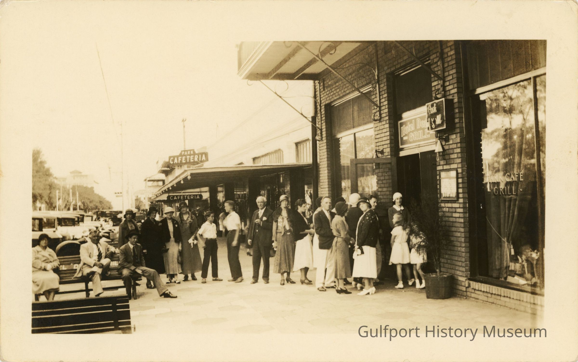 A black and white photograph postcard showing people lined up on the sidewalk for the Hotel Dennis Grill. The Park Cafeteria can be seen next door. The potential restaurant patrons are of various ages and some sit on public benches near the road. Parked cars line the street. These two businesses were located across Williams Park in St. Petersburg on 1st Ave N.Subject
