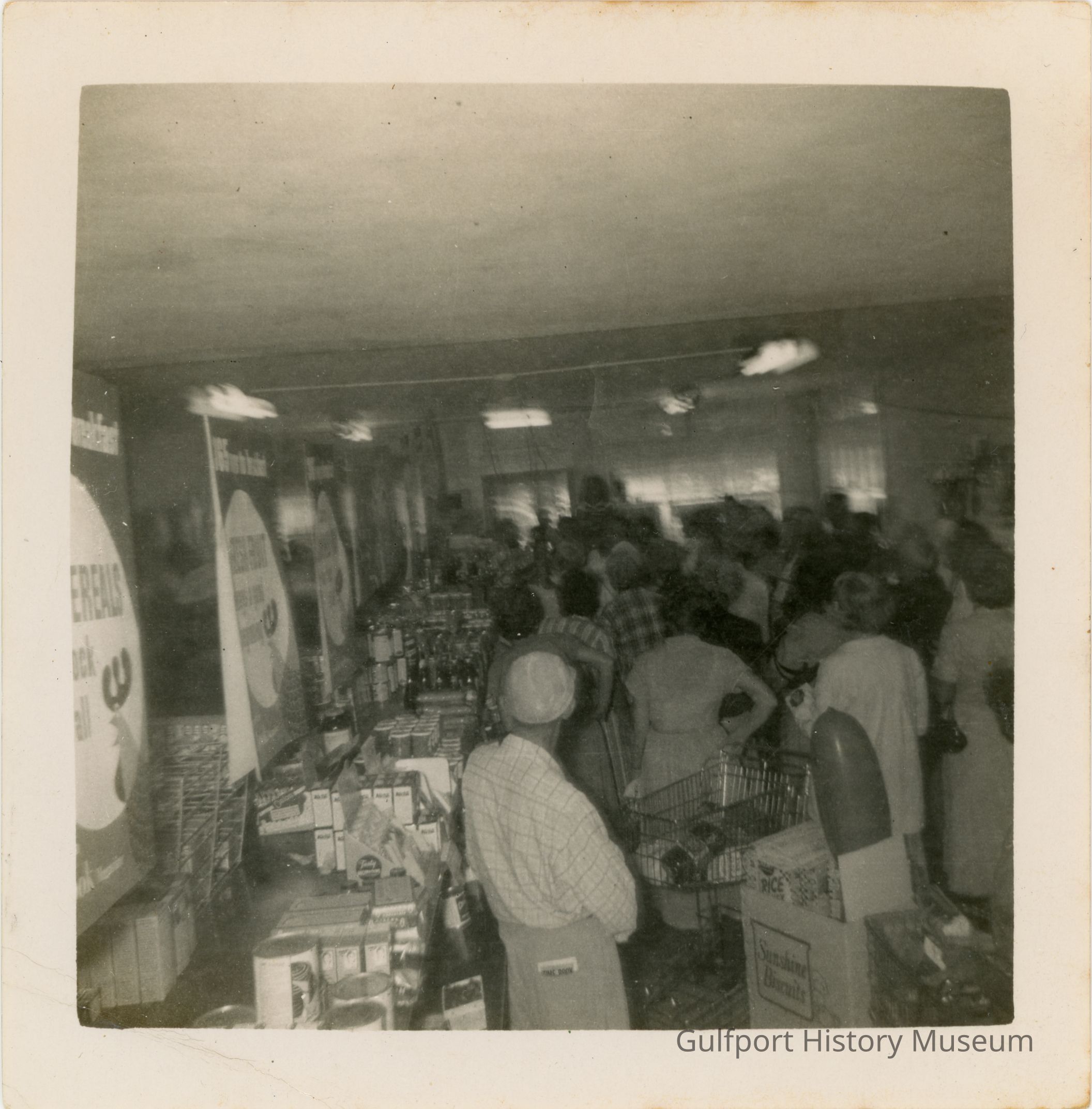 A black and white photograph of the inside of Parker's Food Store, an I.G.A. (Independent Grocer Alliance) Store at 5149 28th Ave S. Shelving, people, and grocery carts fill the floor space. Everyone is facing away from the camera towards a single direction.