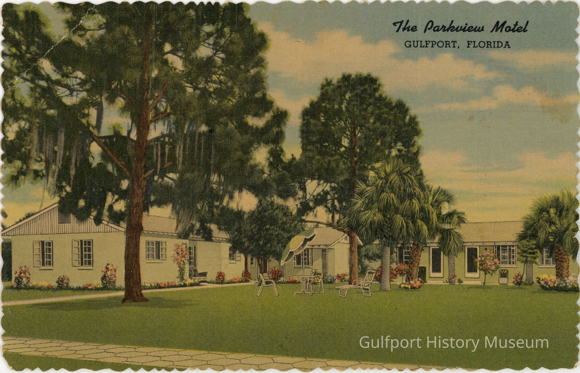 A color linen postcard of The Parkview Motel in Gulfport, Florida. Two light green buildings with white doors and white windows surround a lawn which has a table, umbrella, and two chairs. There are pine and palm trees in the yard and flowers by the building.