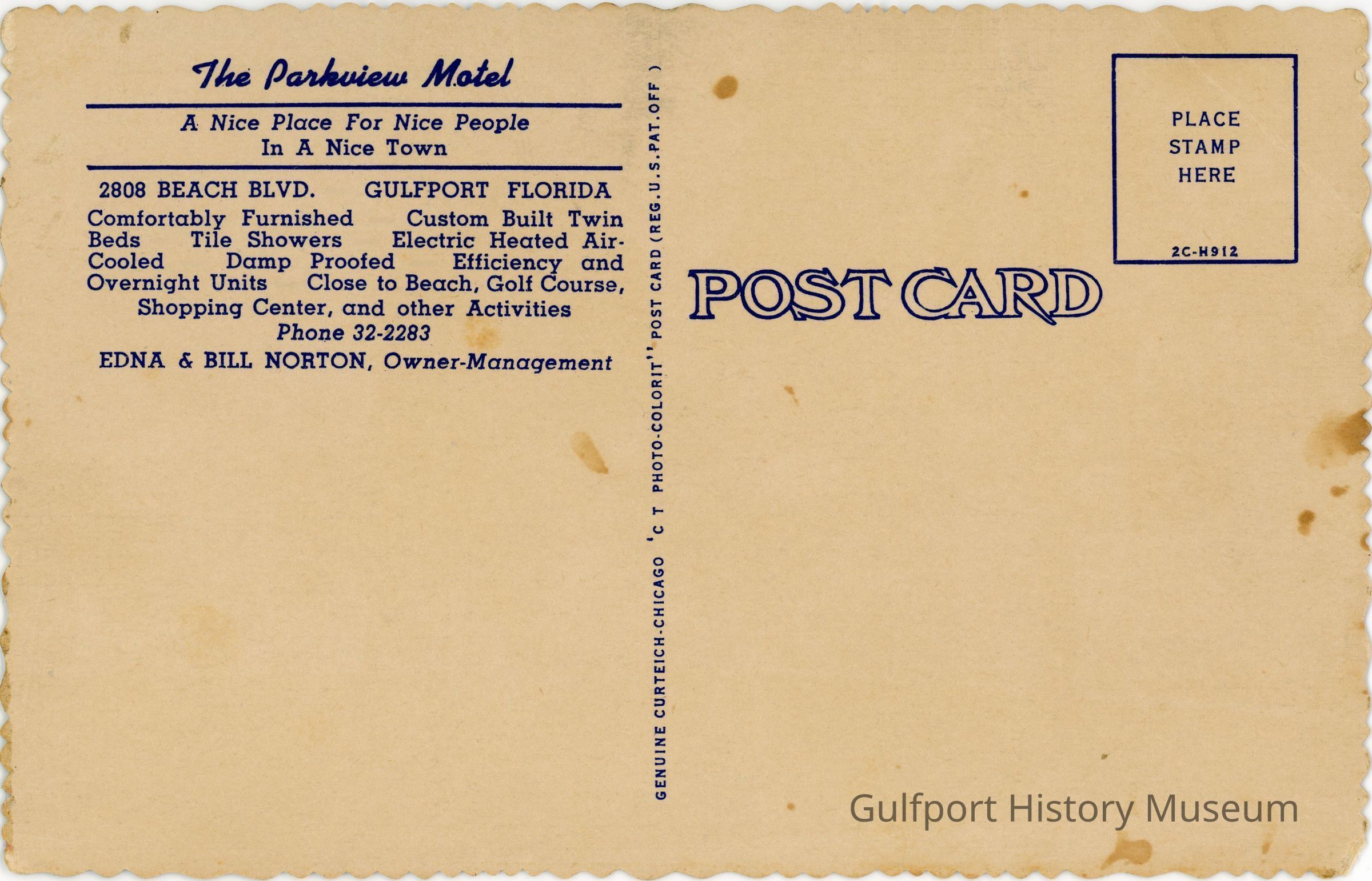 The Parkview Motel / A Nice Place For Nice People / In A Nice Town / 2808 BEACH BLVD. GULFPORT FLORIDA / Comfortably Furnished Custom Built Twin / Beds Tile Showers Electric Heated Air- / Cooled Damp Proofed Efficiency and / Overnight Units Close to Beach, Golf Course, / Shopping Center, and other Activities / Phone 32-2883 / EDNA & BILL NORTON, Owner-ManagementTranscriber