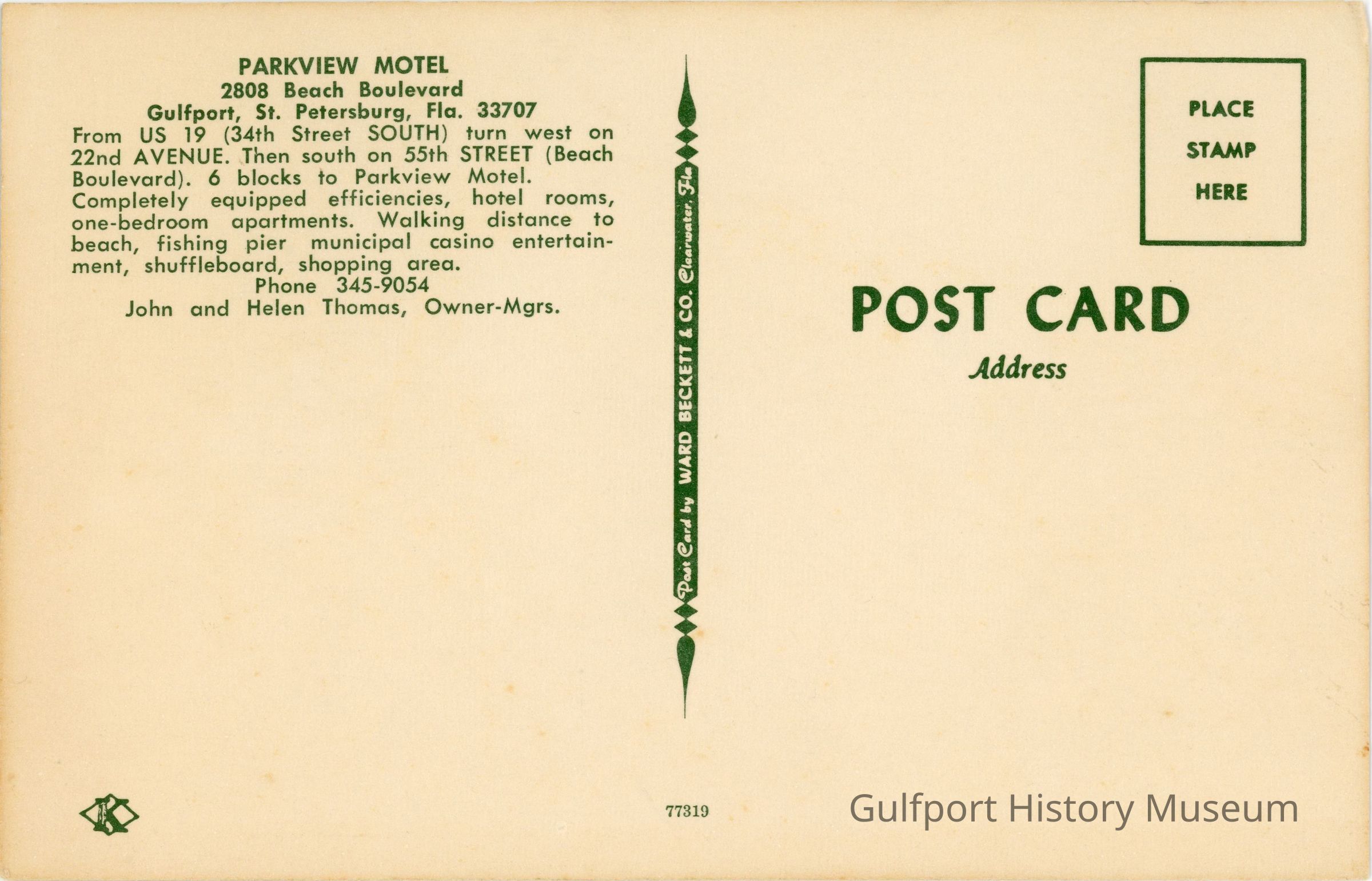 PARKVIEW MOTEL / 2808 Beach Boulevard / Gulfport, St. Petersburg, Fla. 33707 / From US 19 (34th Street SOUTH) turn west on / 22nd AVENUE. Then south on 55th STREET (Beach / Boulevard). 6 blocks to Parkview Motel. / Completely equipped efficiencies, hotel rooms, / one-bedroom apartments. Walking distance to / beach, fishing pier municipal casino entertain- / ment, shuffleboard, shopping area. / Phone 345-9054 / John and Helen Thomas, Owner-Mgrs.