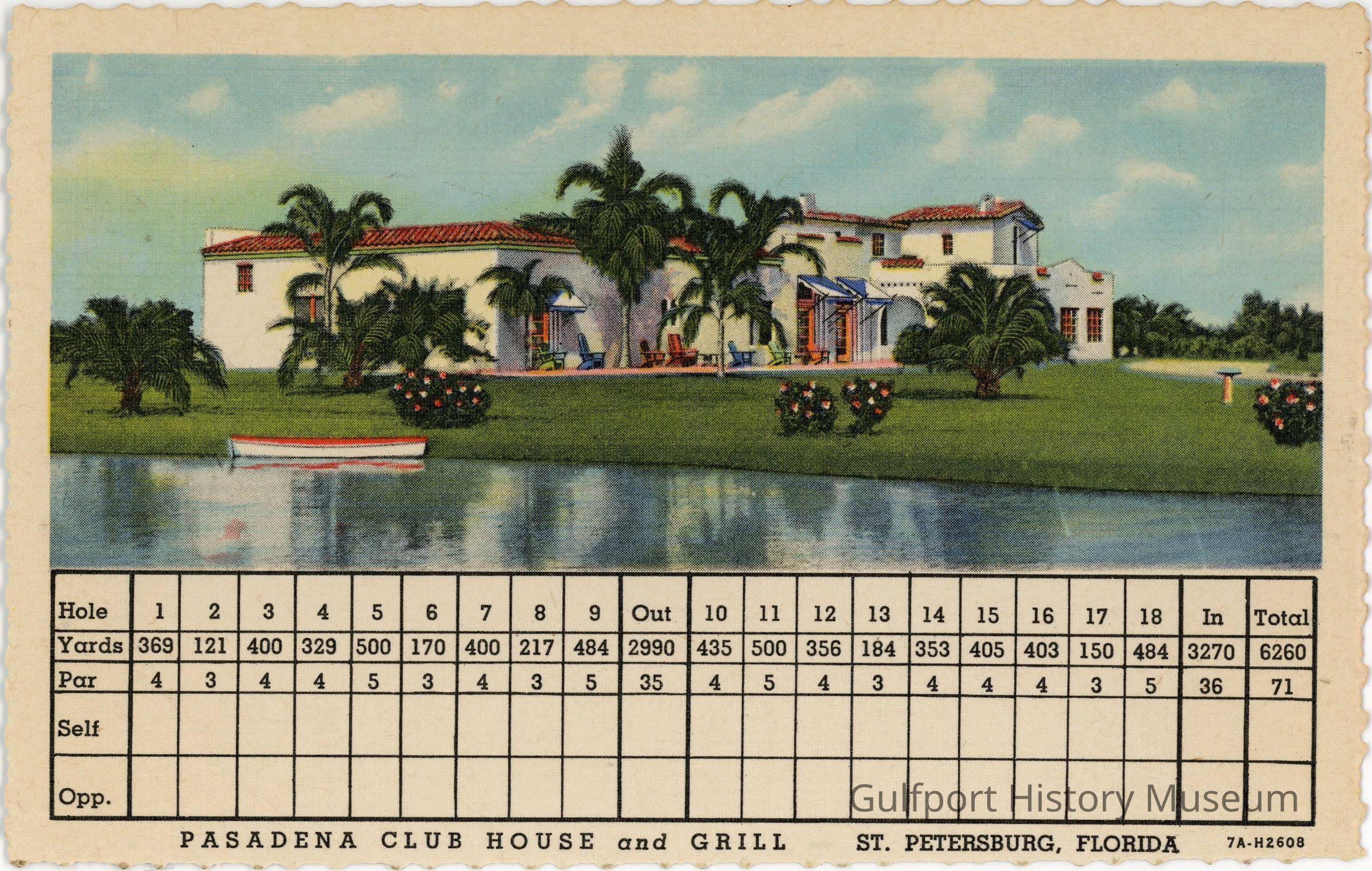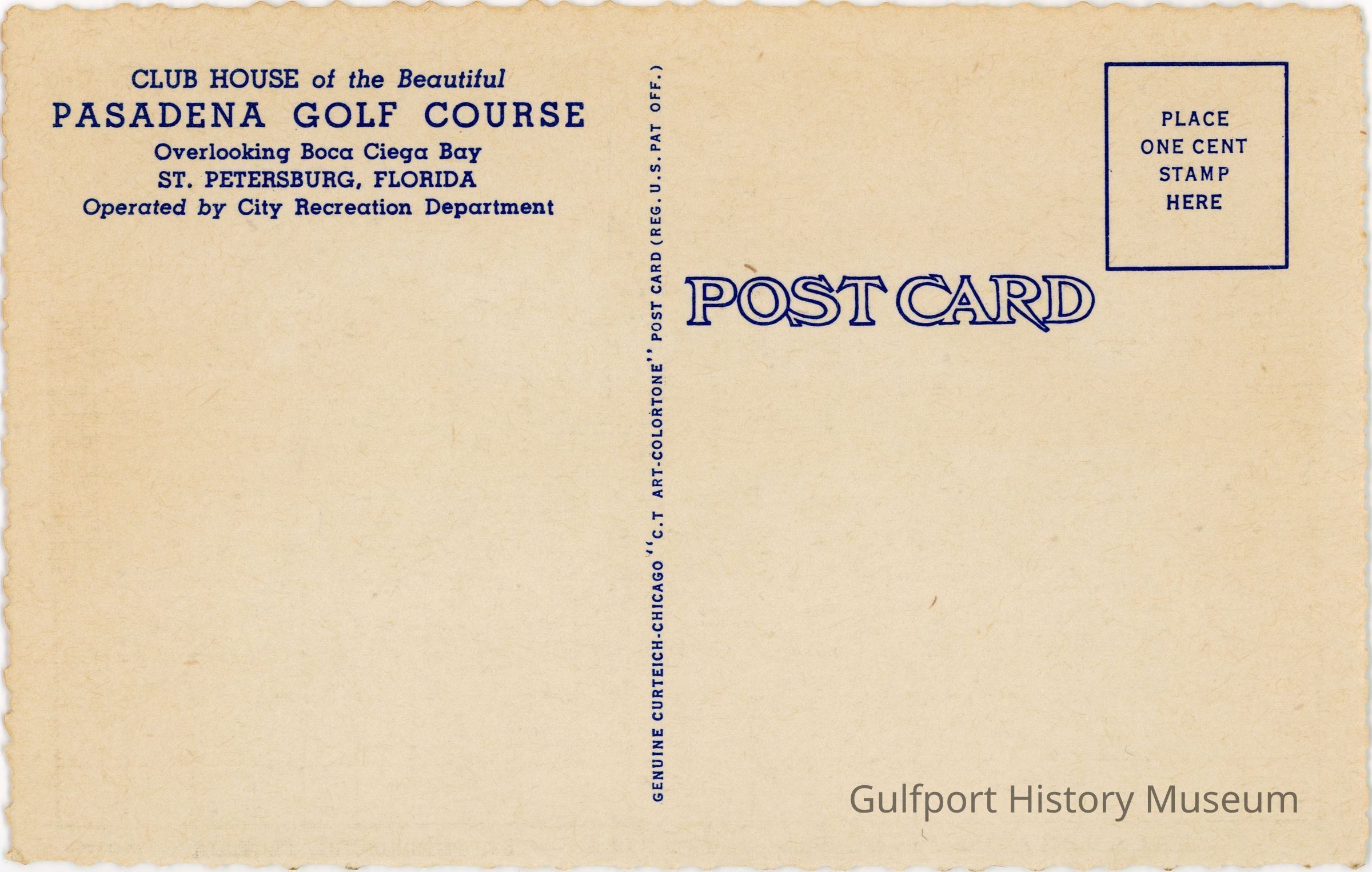 CLUB HOUSE of the Beautiful / PASADENA GOLF COURSE / Overlooking Boca Ciega Bay / ST. PETERSBURG, FLORIDA / Operated by City Recreation DepartmentTranscriber