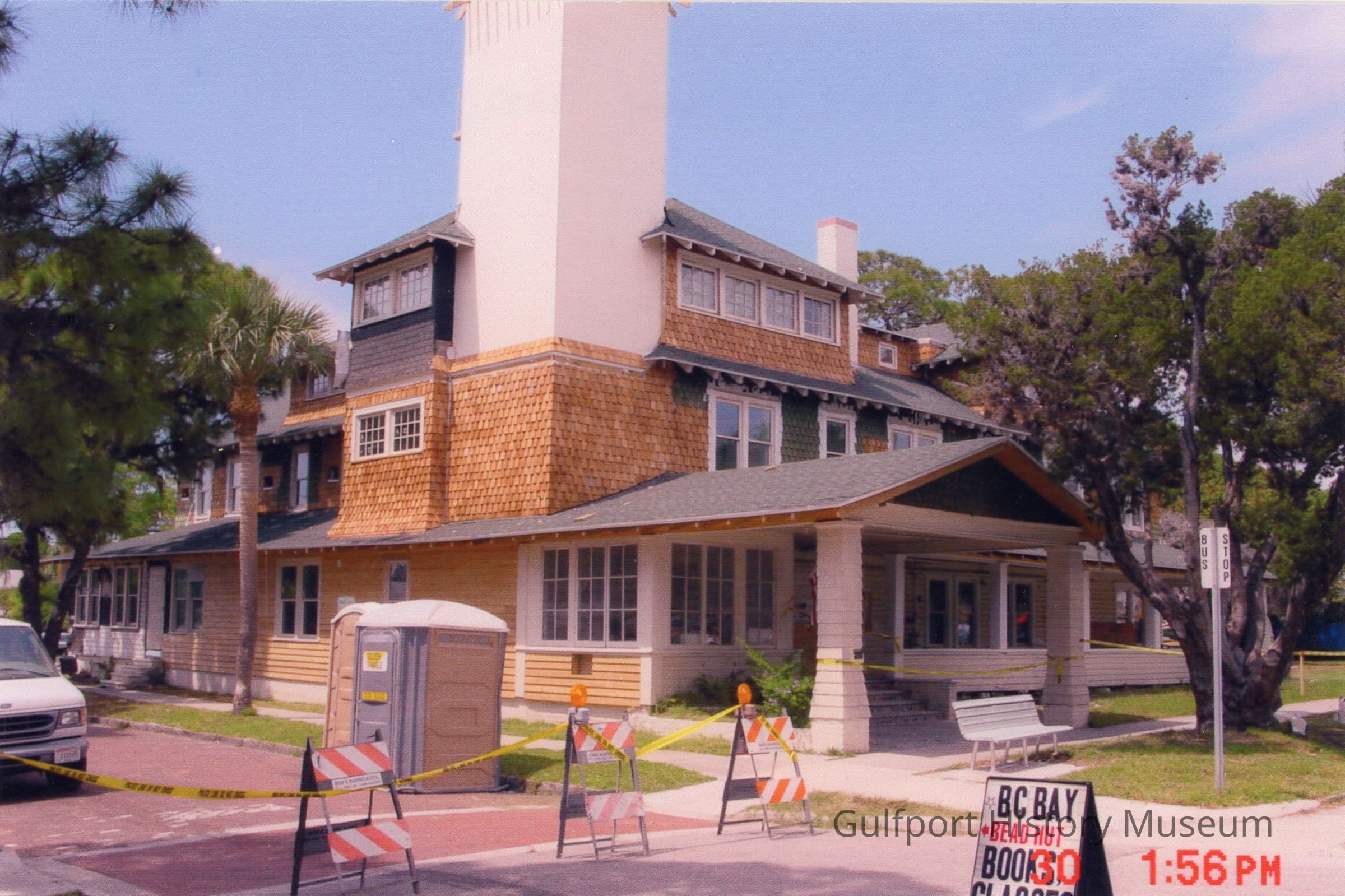 A color photographic print of the Peninsula Inn. There is yellow caution tape blocking the entrance to the building and road next to it, the caution tape reads "POLICE LINE DO NOT CROSS." There two portable toilets outside the building behind the tape. There is also a sign on the street that advertises "BC BAY BEAD HUT BOOKS, CLASSES." The bottom-right corner of the photograph has red digital text reading "30 1:56PM."