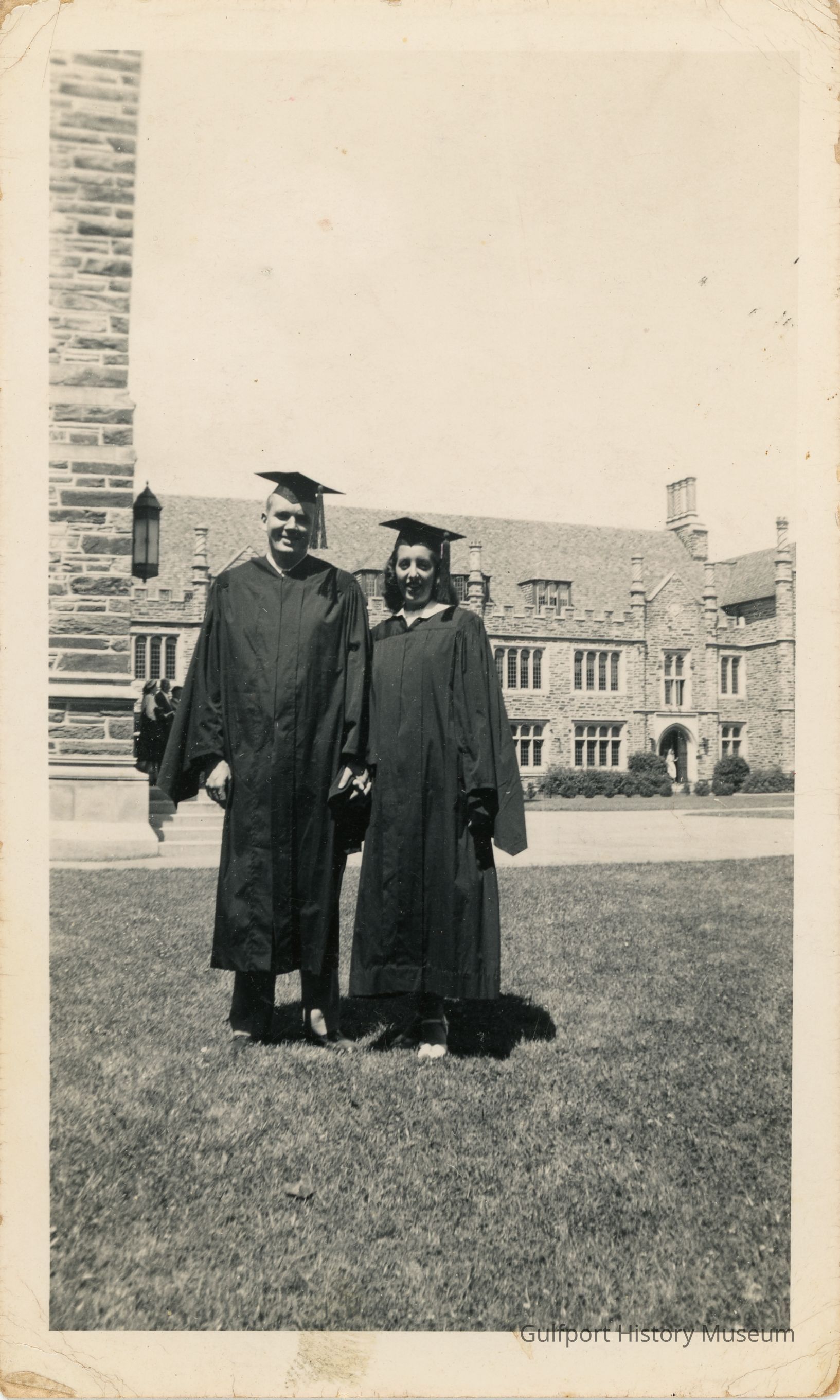 A black and white photograph of Richard Wells, Jr. and [a woman] standing in a courtyard at Duke University wearing graduation robes.
