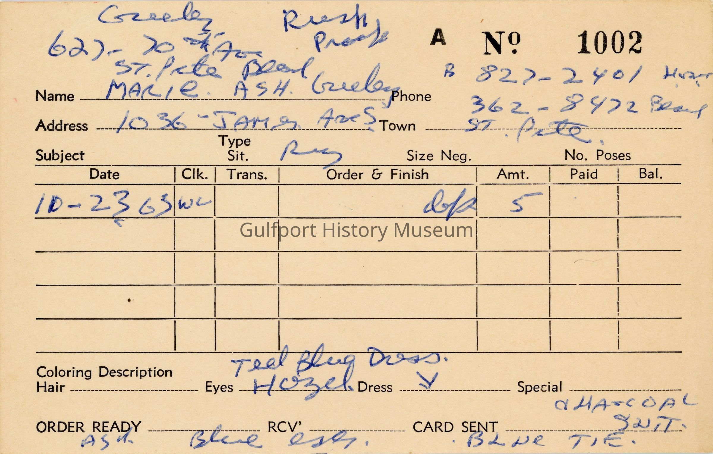 A photography studio order form filled out in blue ink. It reads, "A No. 1002."