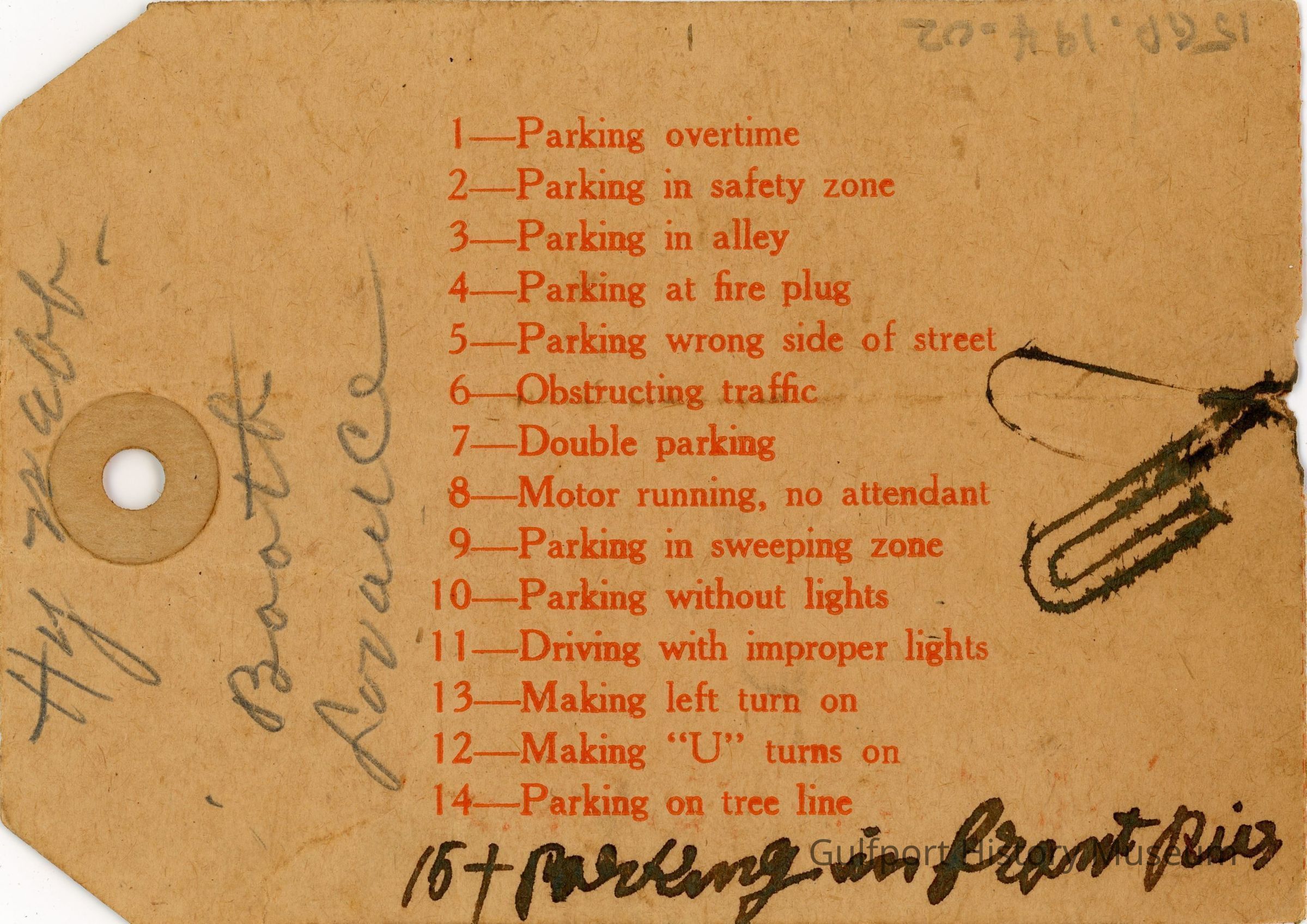1 - Parking overtime / 2 - Parking in safety zone / 3 - Parking in alley / 4 - Parking at fire plug / 5 - Parking wrong side of street / 6 - Obstructing traffic / 7 - Double parking / 8 - Motor running, no attendant / 9 - Parking in sweeping zone / 10 - Parking without lights / 11 - Driving with improper lights / 13 - Making left turn on / 12 - Making "U" turns on / 14 - Parking on tree line / 15 + Parking in front pier / Hy Webb (?) / Booth [?]Language