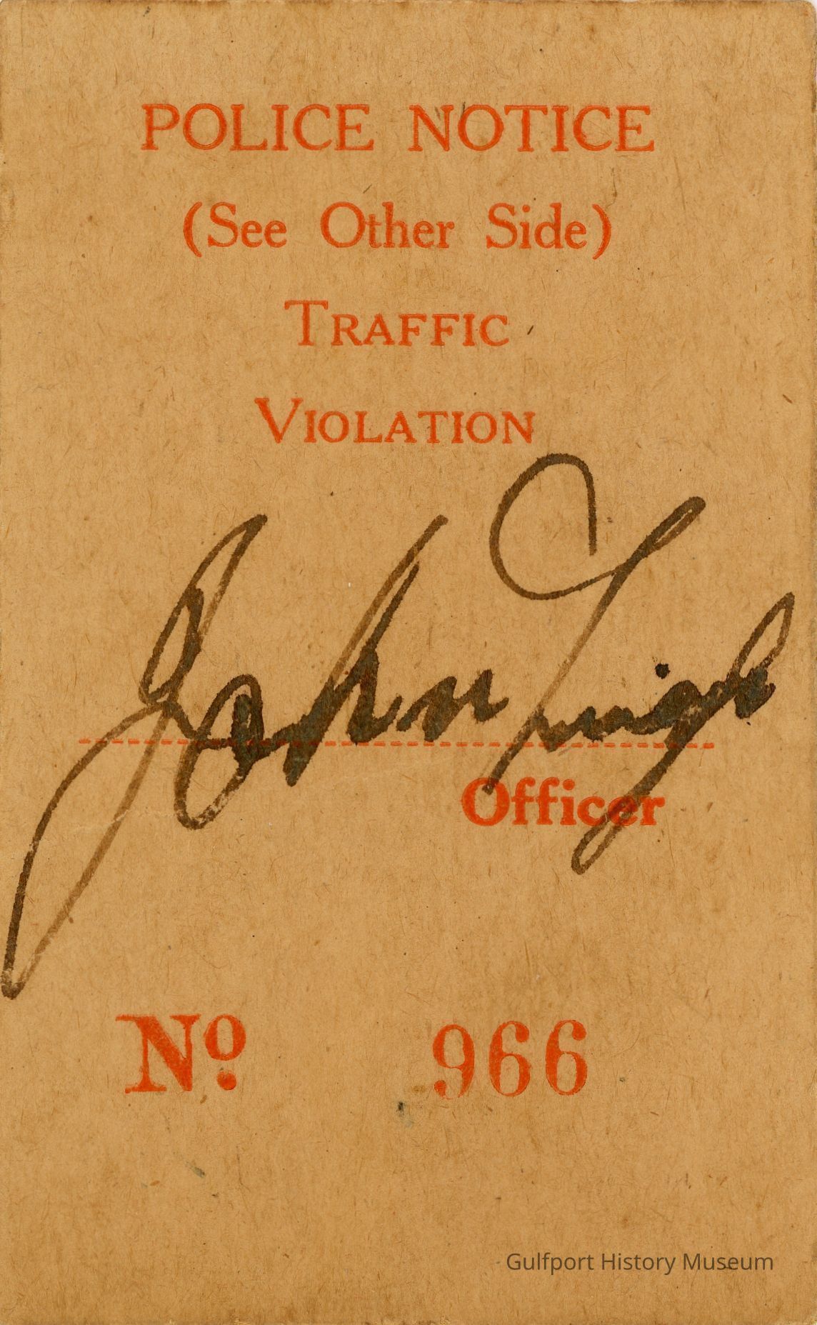 POLICE NOTICE / (See Other Side) / TRAFFIC / VIOLATION / John Leigh / Officer / No. 966Language