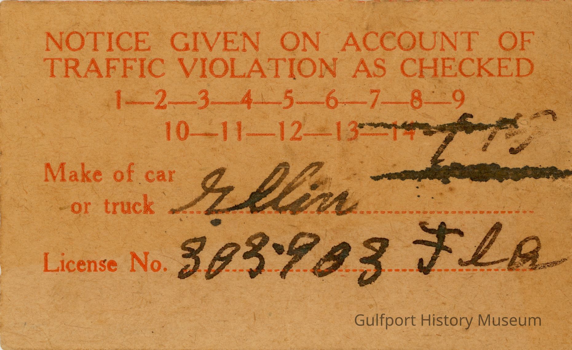NOTICE GIVEN ON ACCOUNT OF TRAFFIC VIOLATION AS CHECKED / 1 - 2 - 3 - 4 - 5 - 6 - 7 - 8 - 9 / 10 - 11 - 12 - 13 - 14 [?] / Make of car or truck Rollin (?) / License No. 303-903 FlaLanguage