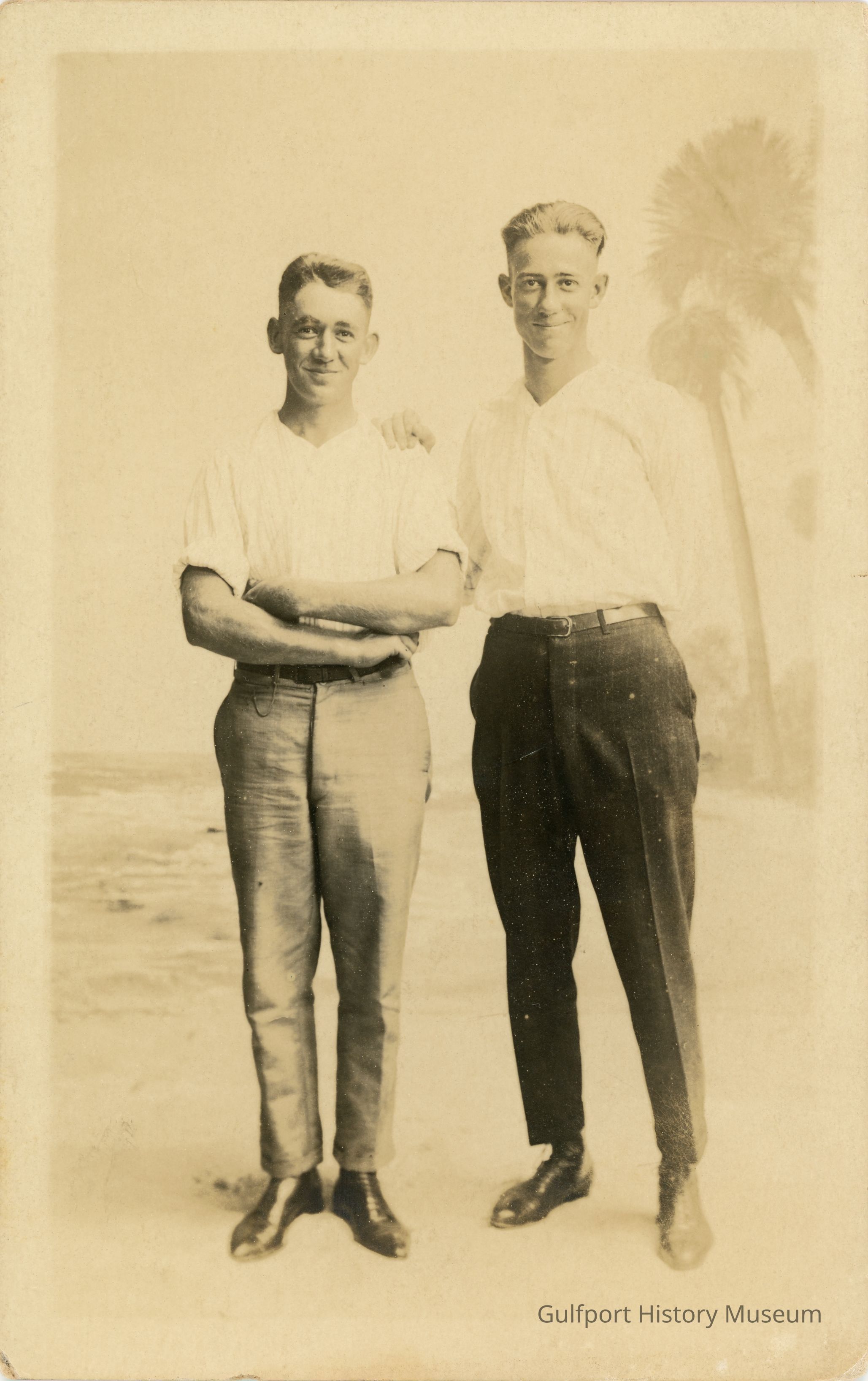 A black and white photograph postcard of two men standing on a beach. They are both wearing white, collarless, button-up, striped shirts, trousers with belts, and black shoes. Palm trees line the beach. Seafoam and waves are hitting the shore.Subject