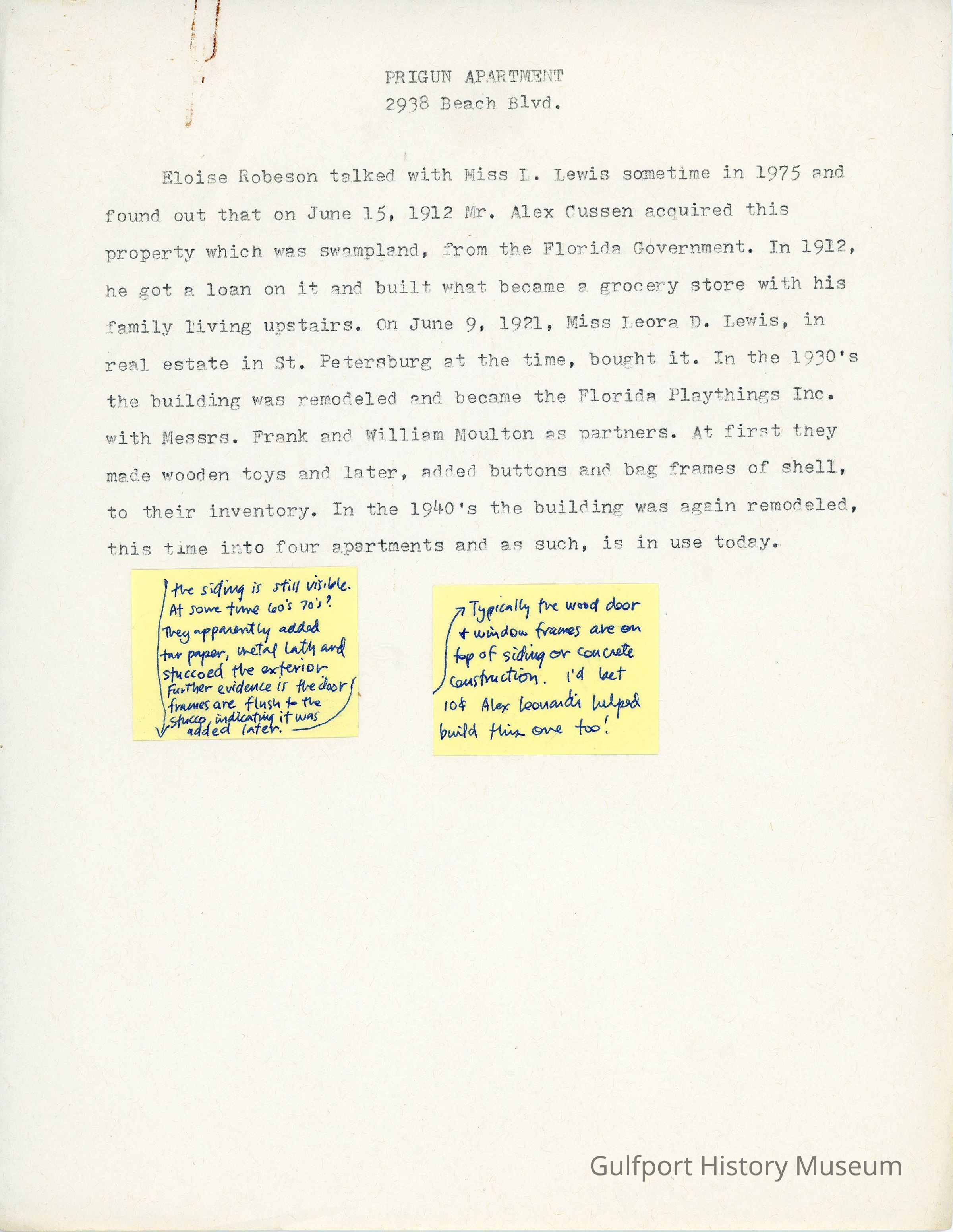 Eloise Robeson talked with Miss L. Lewis sometime in 1975 and found out that on June 15, 1912 Mr. Alex Cussen [sic?] acquired this property which was swampland, from the Florida Government. In 1912, he got a loan on it and built what became a grocery store with this family living upstairs. On June 9, 1921, Miss Leora D. Lewis, in real estate in St. Petersburg at the time, bought it. In the 1930's the building was remodeled and became the Florida Playthings Inc. with Messrs. Frank and William Moulton as partners. At first they made wooden toys and later, added buttons and bag frames of shell, to their inventory. In the 1940's the building was again remodeled, this time into four apartments and as such, is in use today.