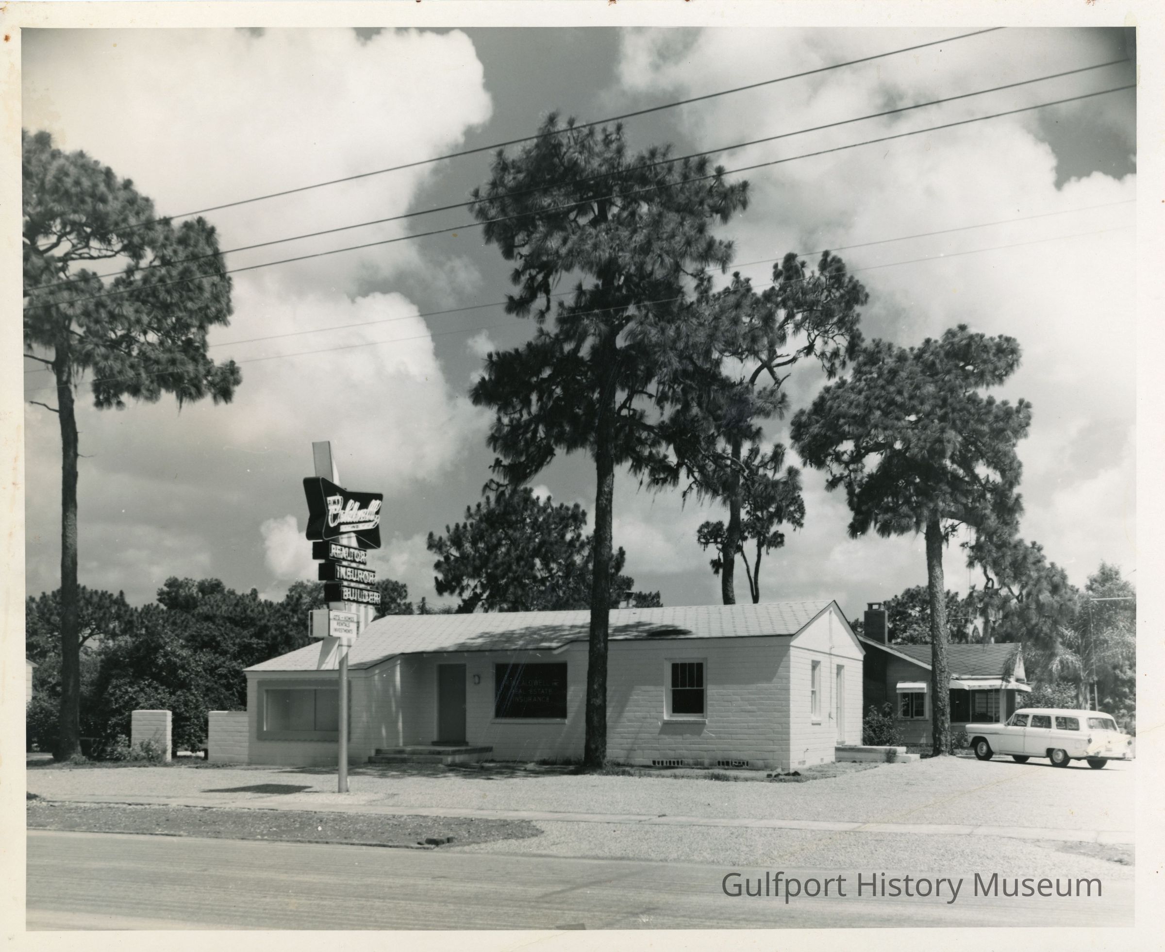 A black and white photograph of the R.W. Caldwell office building on Gulfport Blvd. The large sign in front reads: "R.W. Caldwell REALTOR INSUROR BUILDING." There is another building in the background, and a white car is parked between the two.
