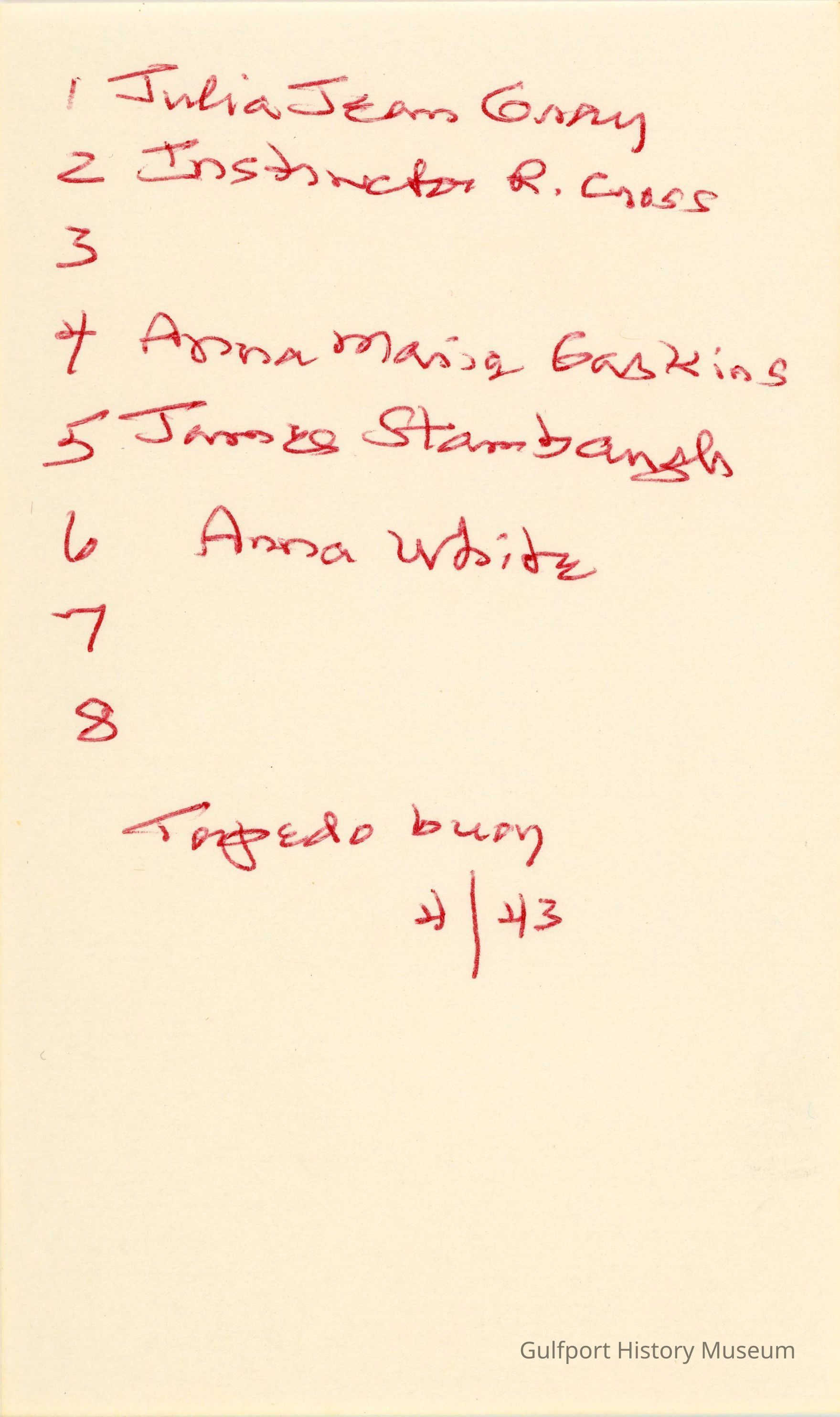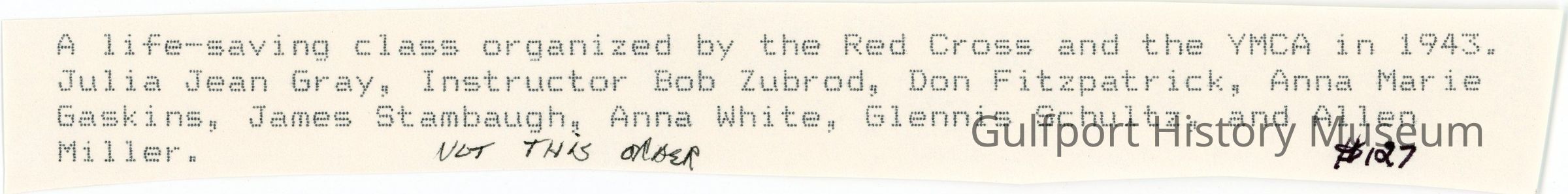 A life-saving class organized by the Red Cross and the YMCA in 1943. Julia Jean Gray, Instructor Bob Zubrod, Don Fitzpatrick, Anna Marie Gaskins, James Stambaugh, Anna White, Glennis Schultz, and Allen Miller. NOT THIS ORDER #127Language
