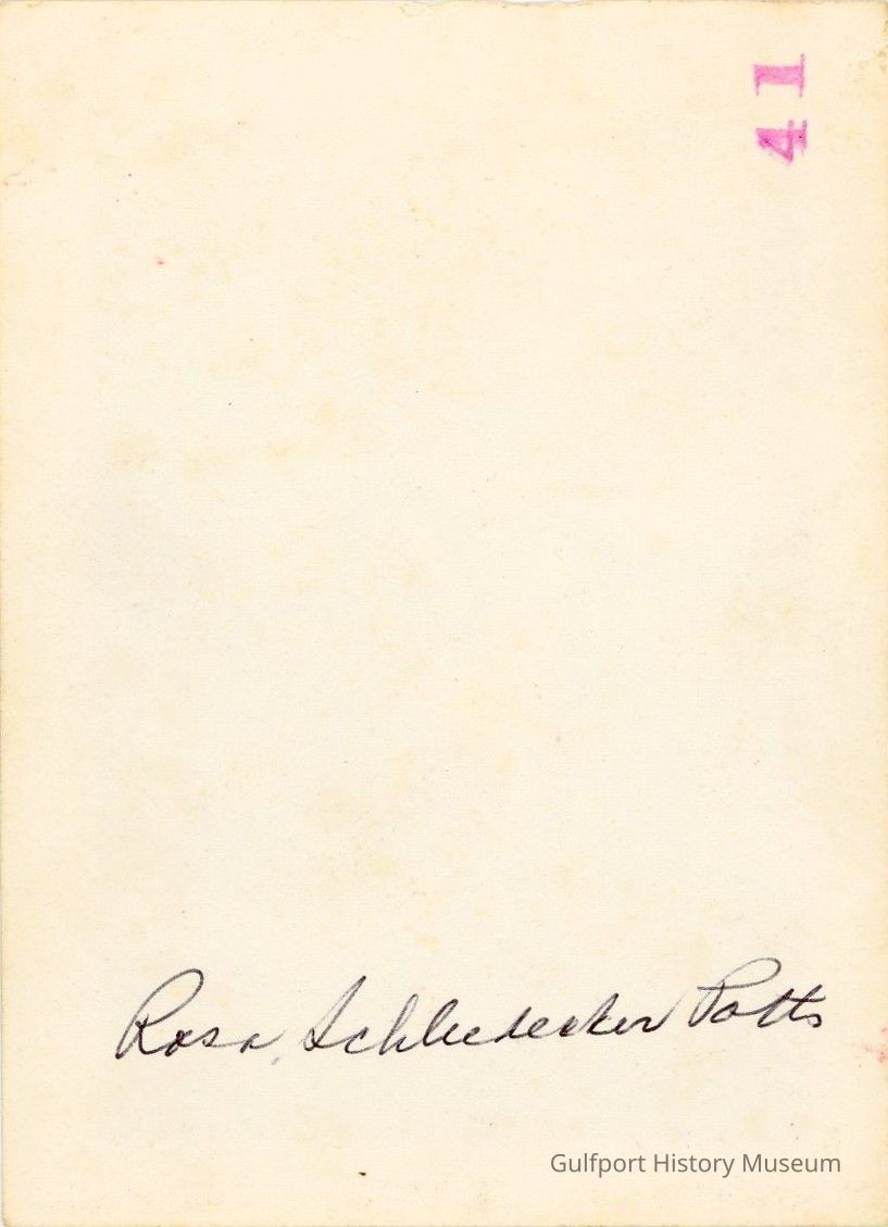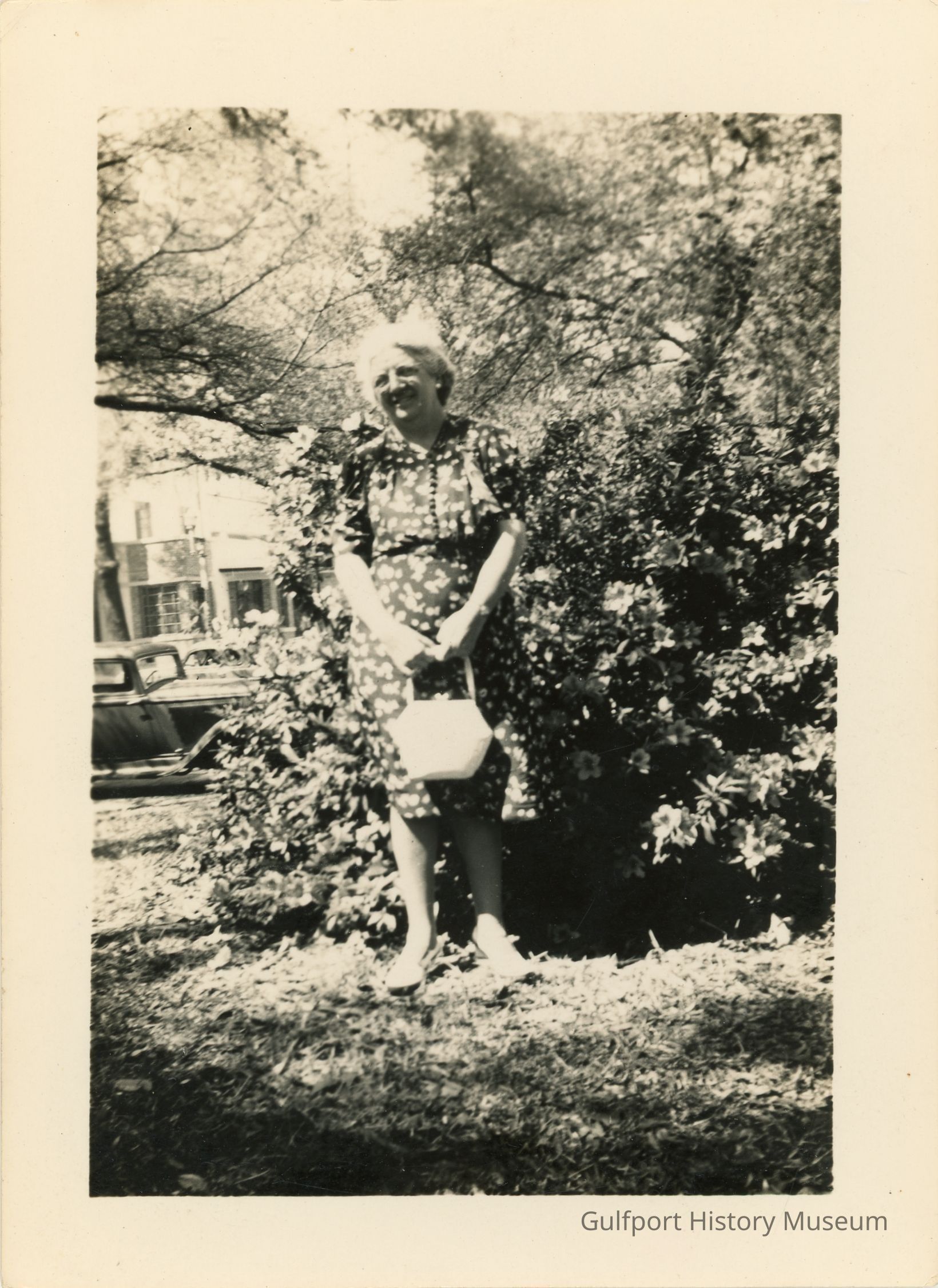 A black and white photograph of Rosa Schludecker (Potts) standing in [a park].