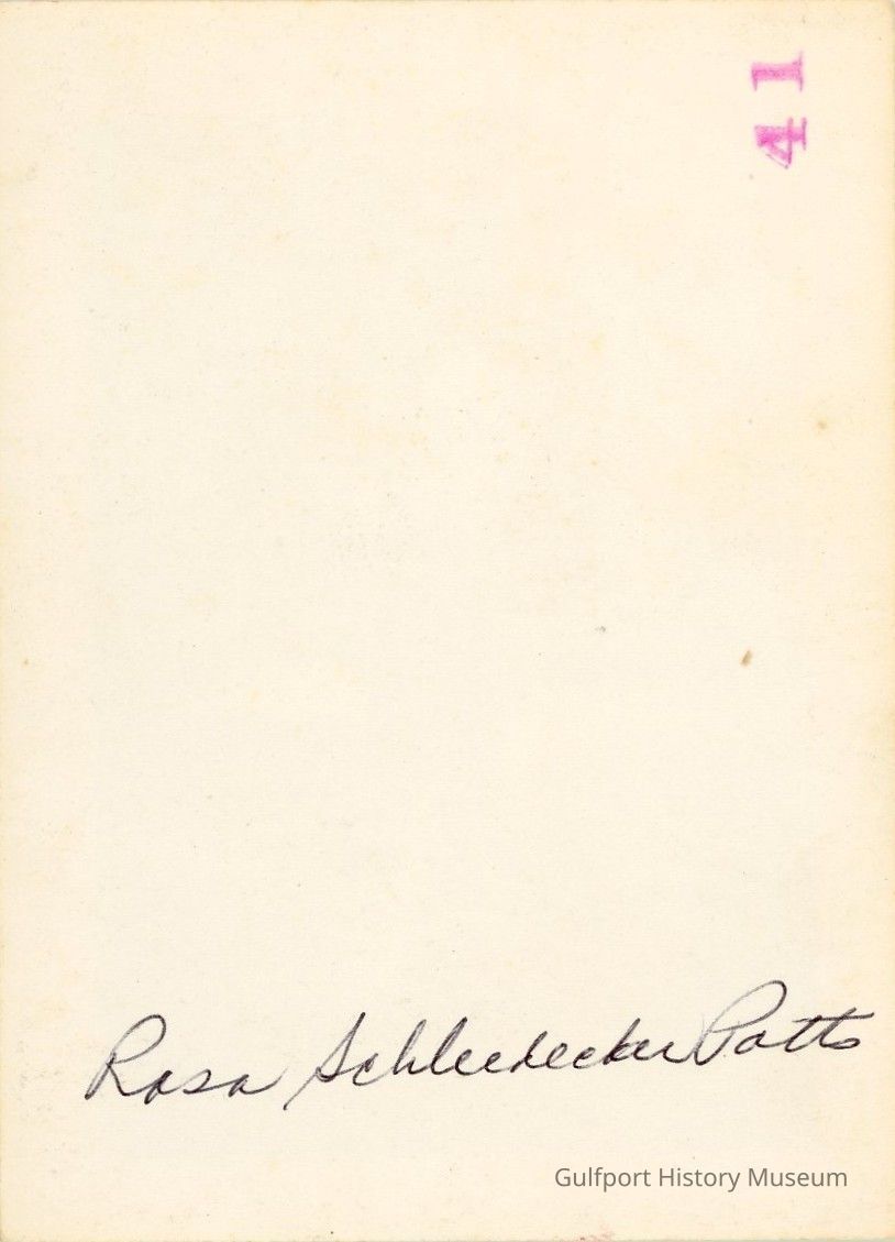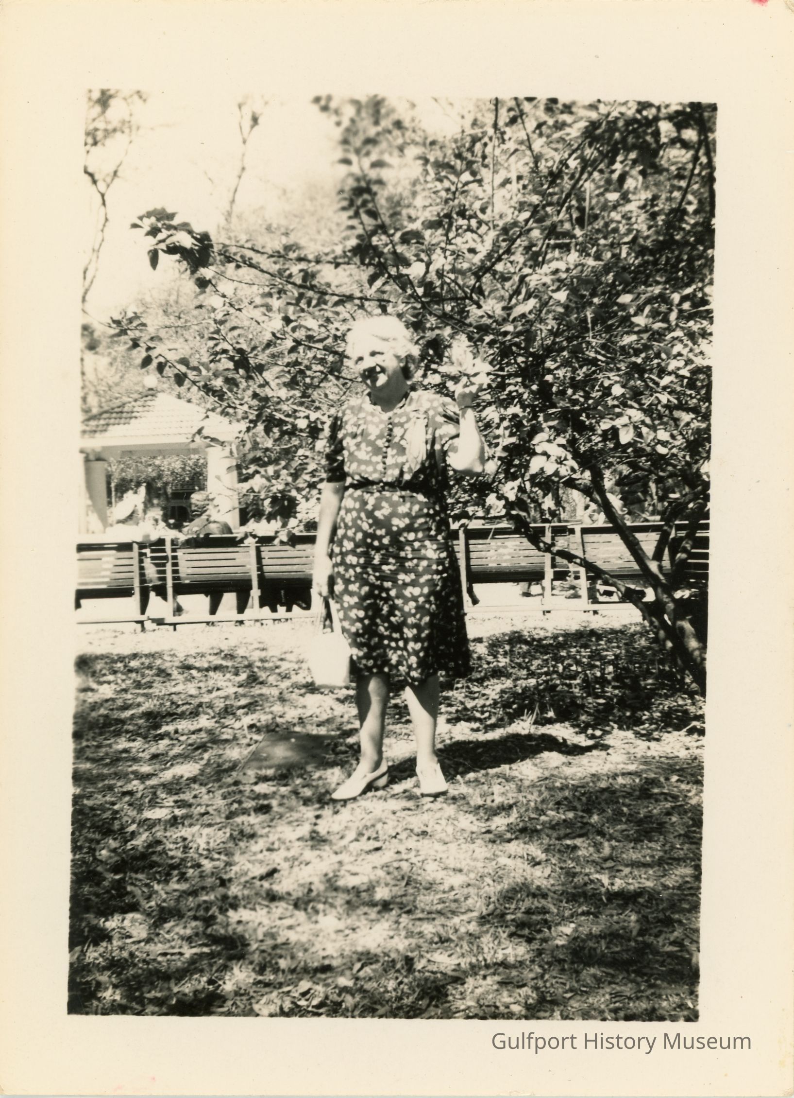 A black and white photograph of Rosa Schludecker (Potts) standing in [a park].