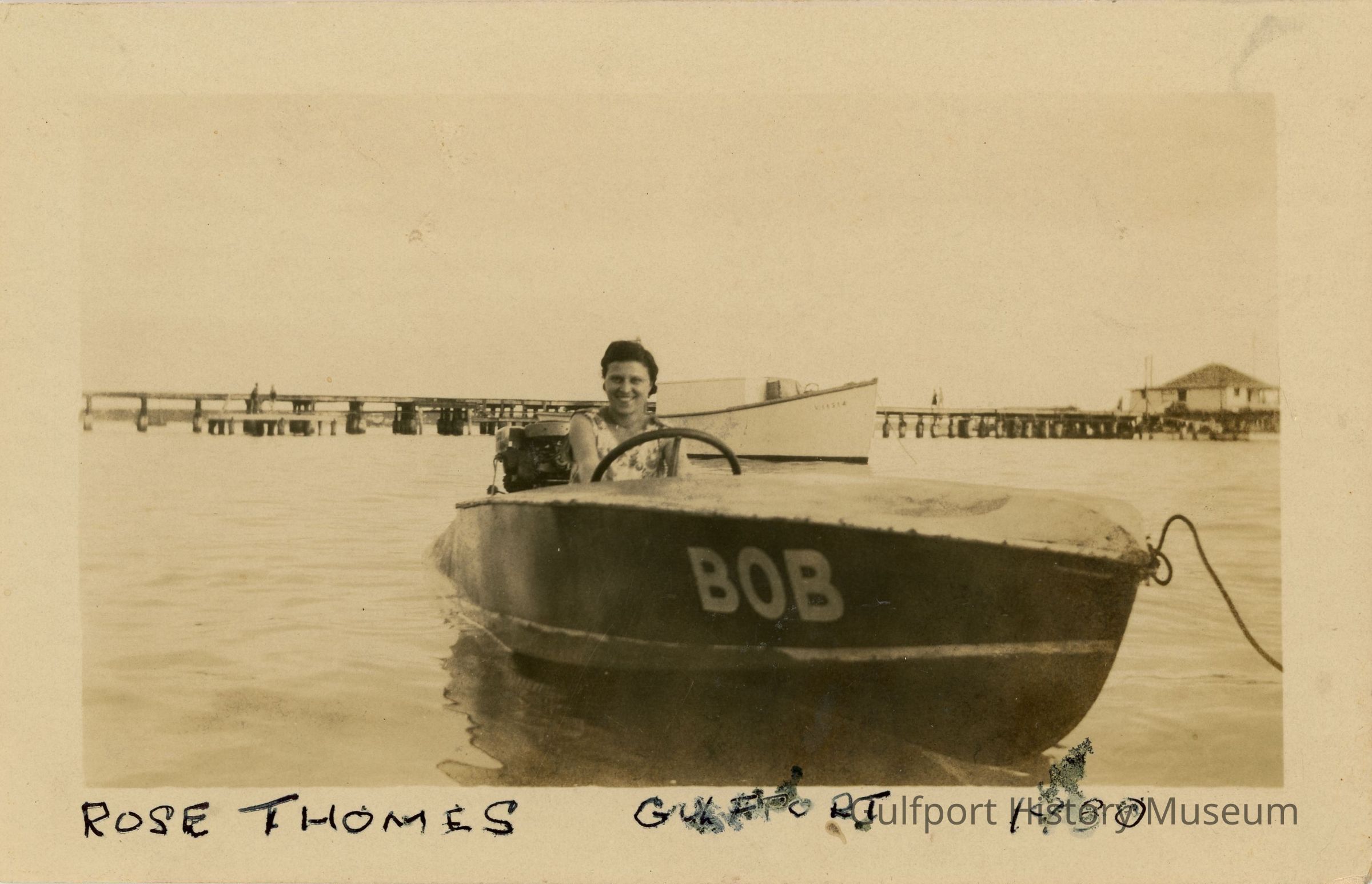 A black and white photograph of a woman in a motorboat. She is smiling at the camera. Writing painted on the front of the boat says "BOB." The Gulfport Pier can be seen in the background. Handwriting in ink on the bottom of the photograph reads "ROSE THOMES GULFPORT 1930," although the ink has been smudged. The pier and pier concession building can be seen in the background on the water.
