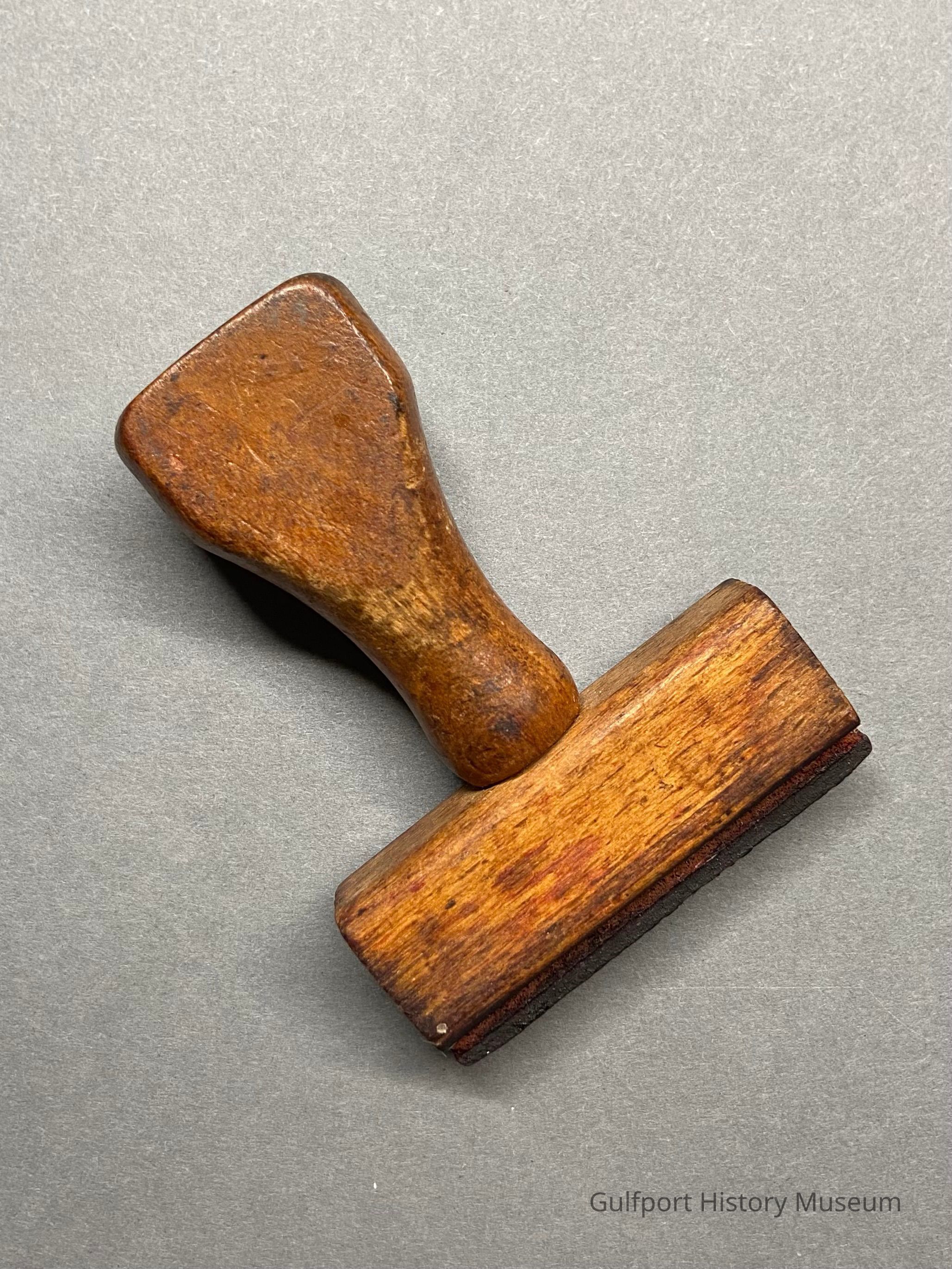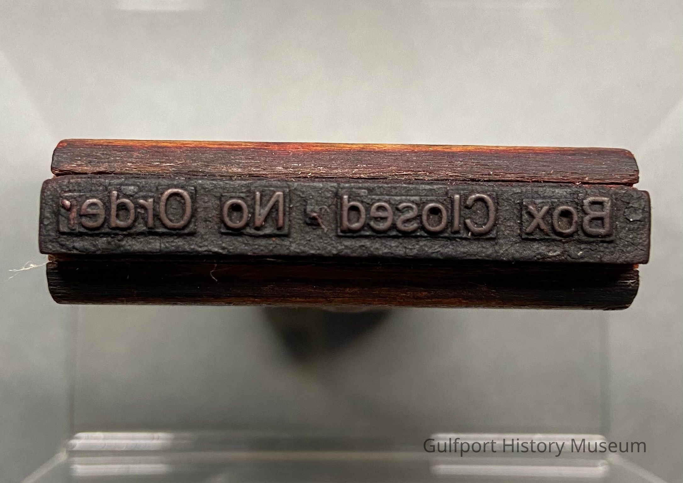 A wooden handle rubber stamp. "Box Closed • No Order"