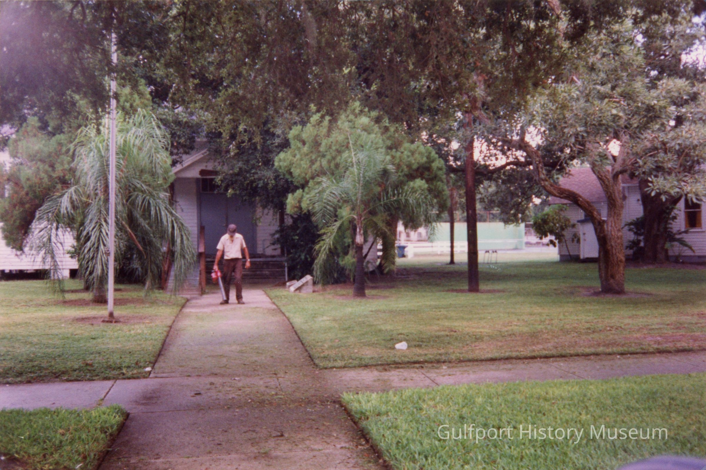A color photograph of ["Jake" Pauley] using a leaf blower to clear the pathway leading to Scout Hall of lawn debris. The back of the Gulfport History Museum, as well as the Chase Park tennis courts, are visible in the background.