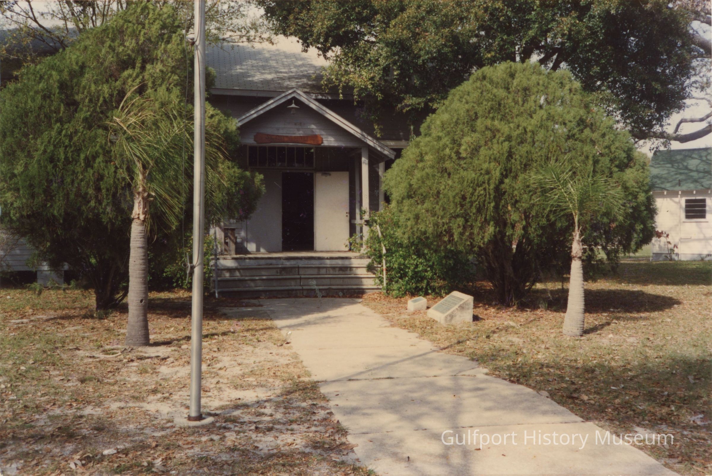 A color photograph of Scout Hall. The door is open, but it's too dark to see inside. There are a few trees and a flagpole in front of the building, making it difficult to see the whole building. A portion of the Gulfport History Museum is visible in the background.