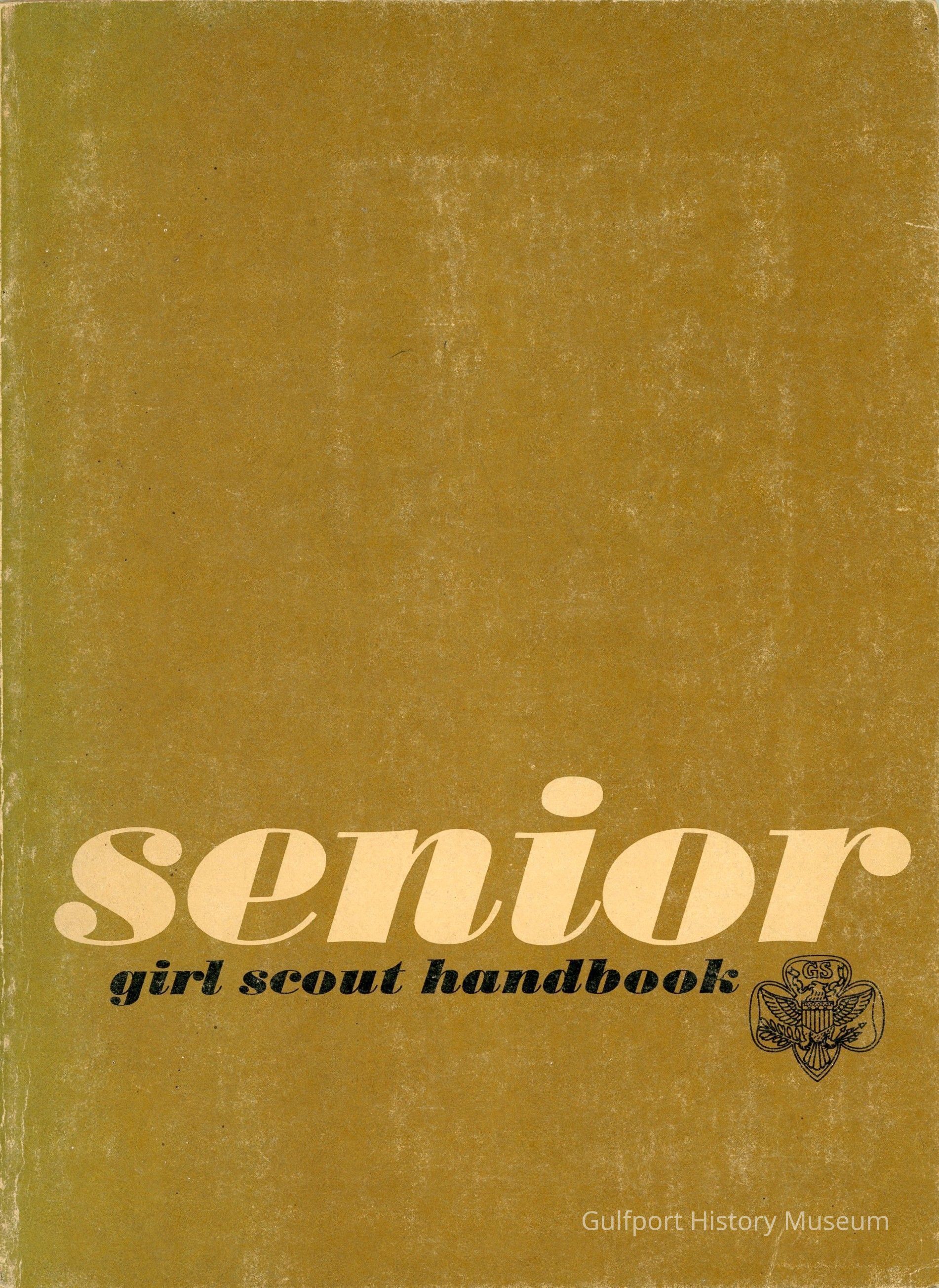 A 1963 Senior Girl Scout handbook. Gold/brown with a small trefoil design next to title.