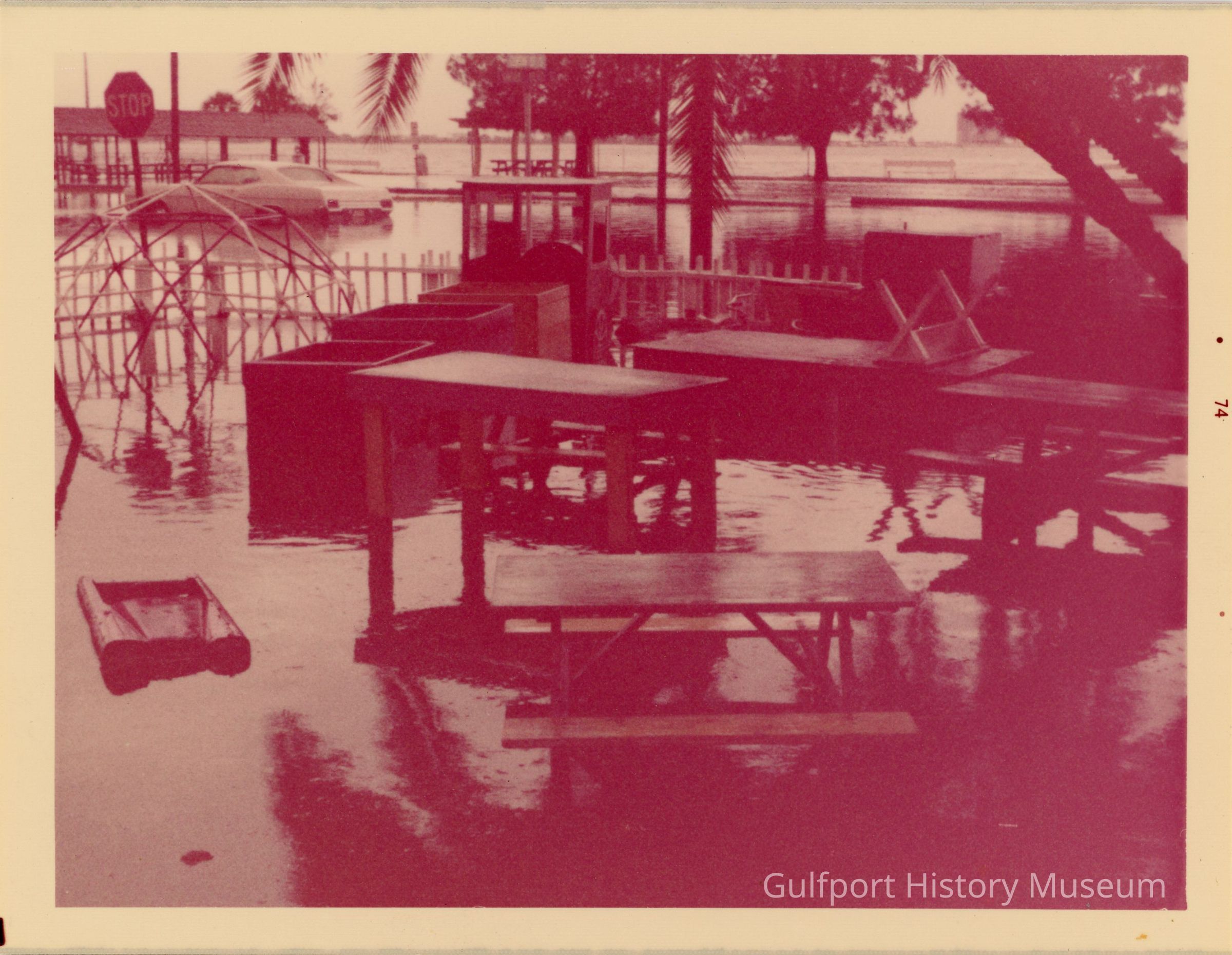A photograph of a flooded Shaffers' playfield, including a partially submerged toy car and climbing dome. In the background is a stalled car on Shore Blvd near Gulfport Beach. Boca Ciega Bay is visible in the distance. Text on the right reads "74".