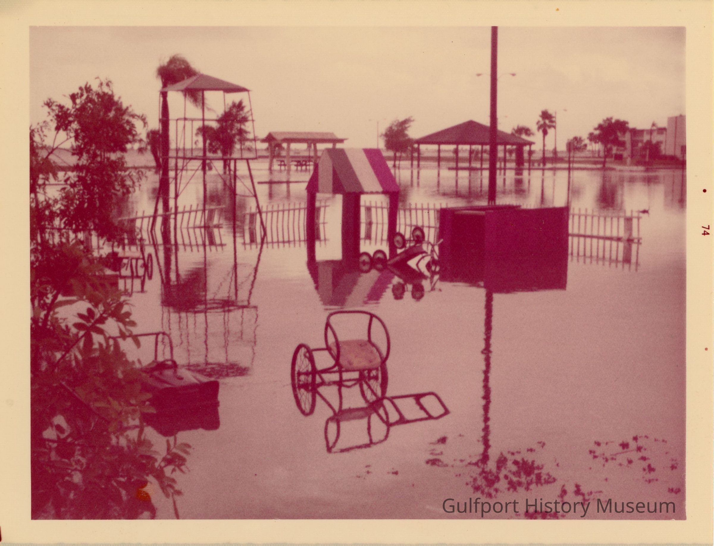 A photograph of the flooded playfield at Shaffers' looking out to Shore Blvd and Gulfport Beach. There are overturned wagons and tricycles, and a jungle gym.
